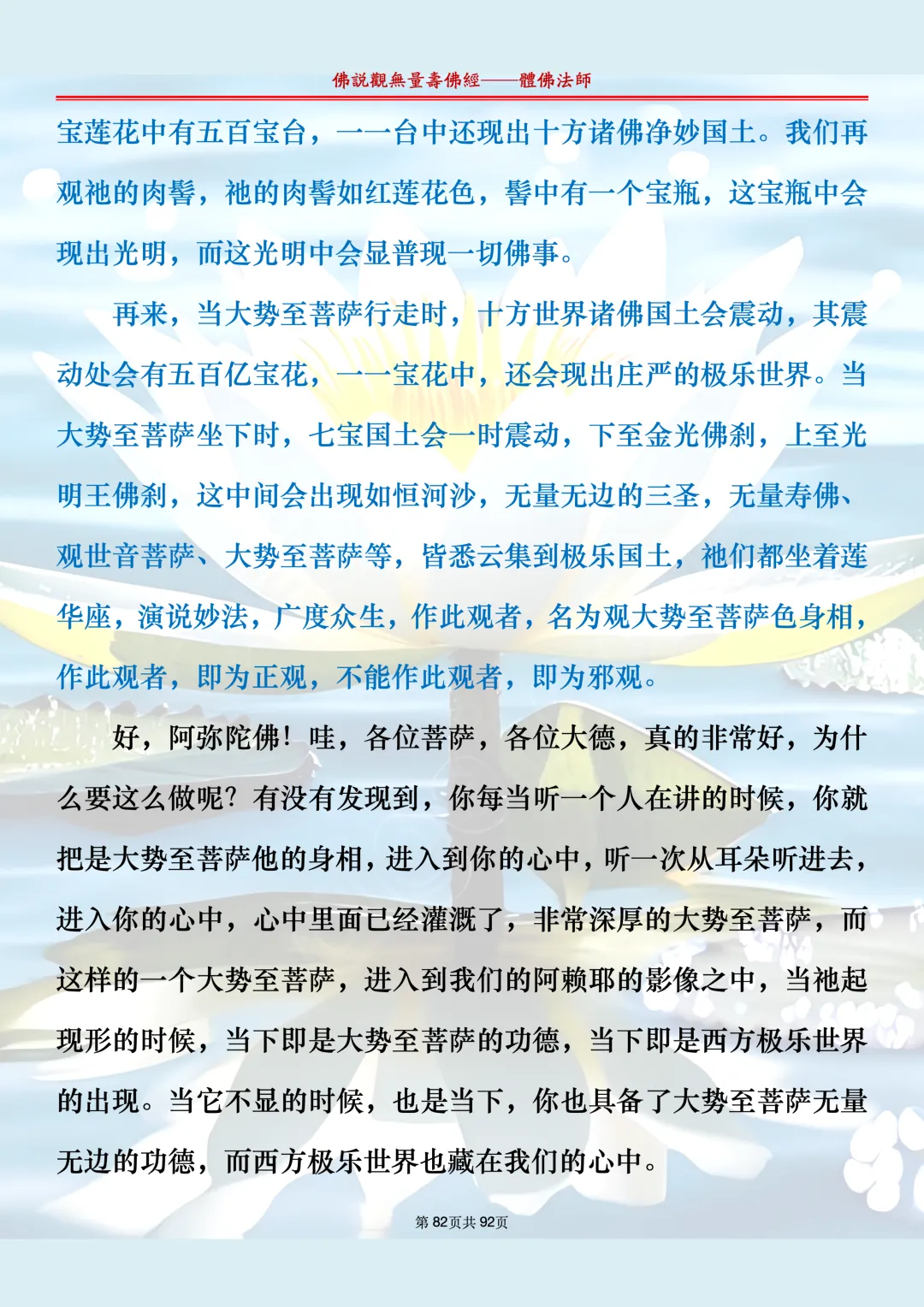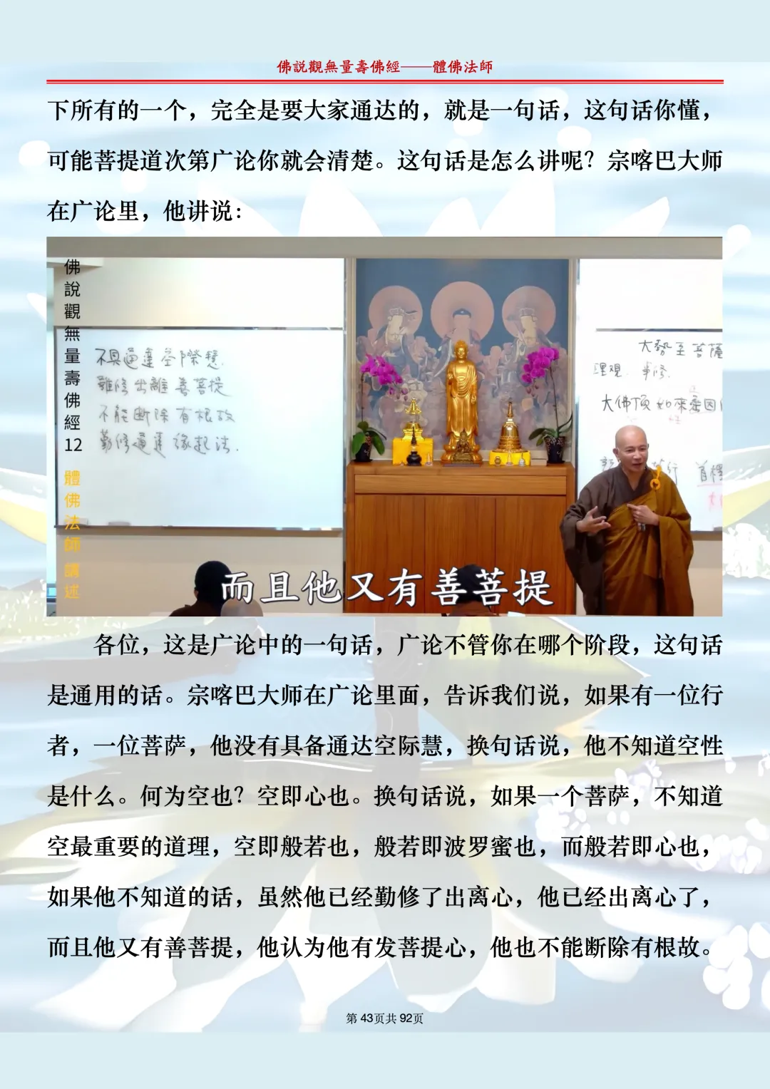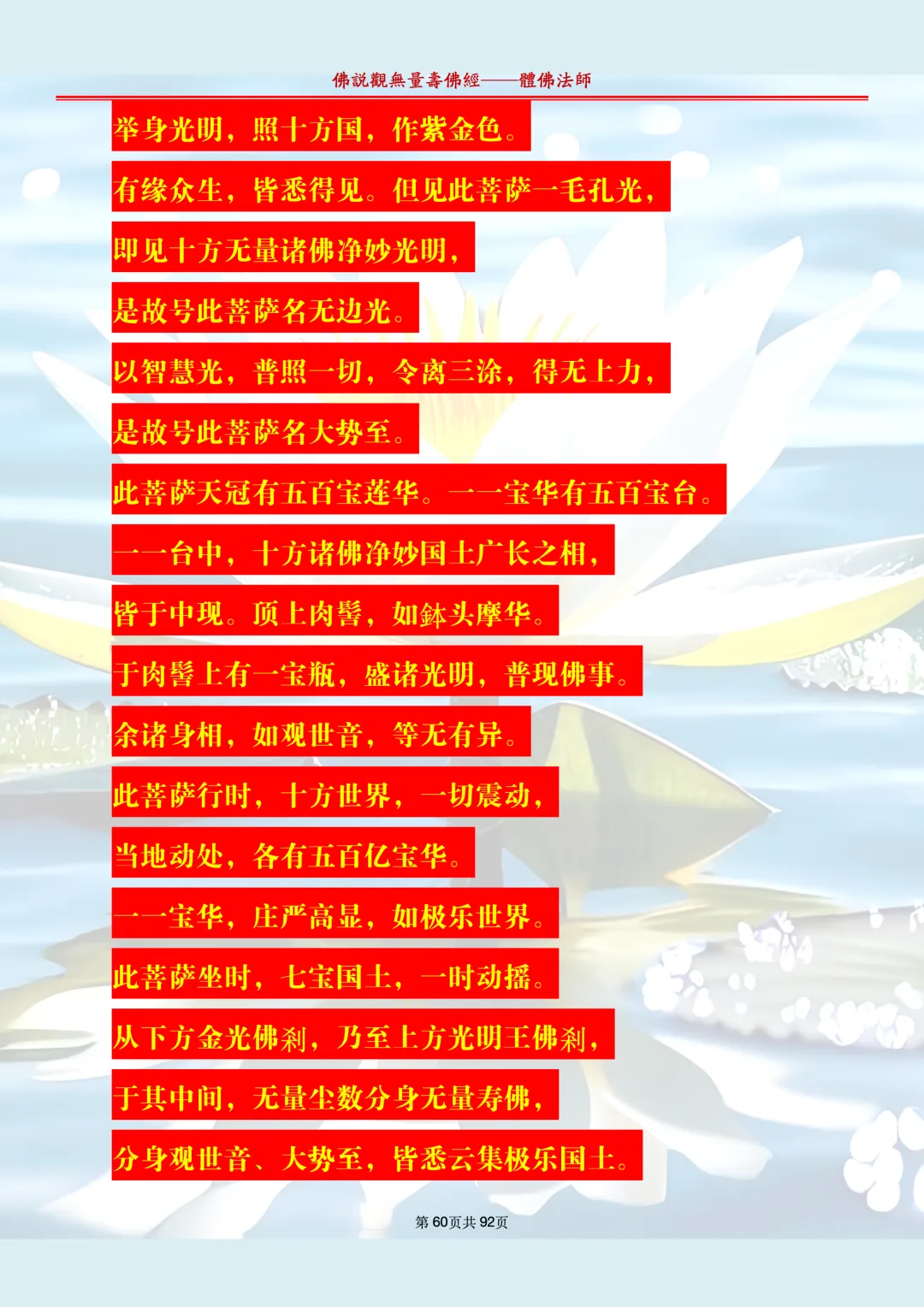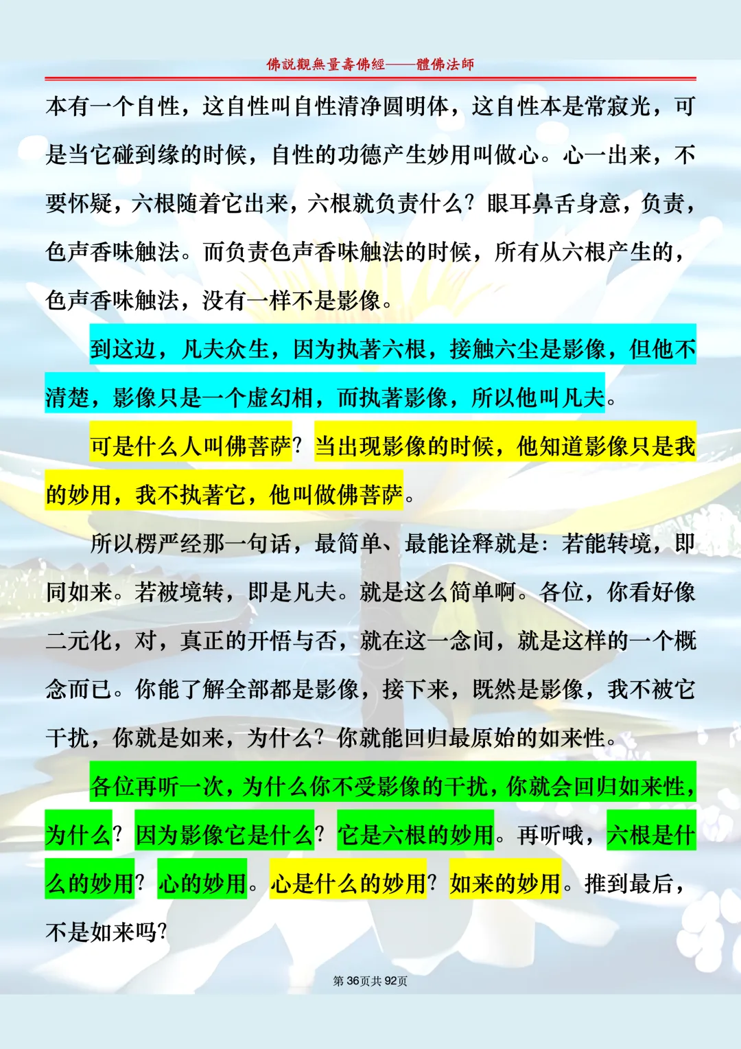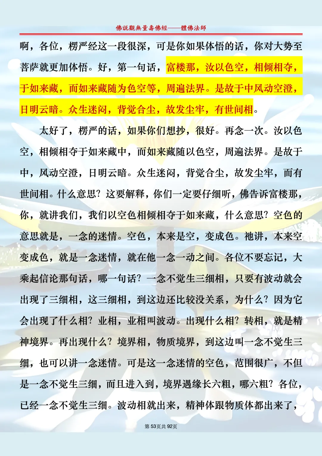 体佛法师讲解的《佛说观无量寿佛经》讲义,文字文档分享,是严格按照视频所讲,一句一句校对而整理,不出自任何团队,也不属于任何团队,也非视频转换软件提取的文字,所以文字准确率高。每一节课分成二段或者三段,依次分享。文字文档,是方便没有时间观看视频的情况下使用,非作他用,大家时间充裕的情况下,重点还是应以法师讲解的视频为主,文字是其次。