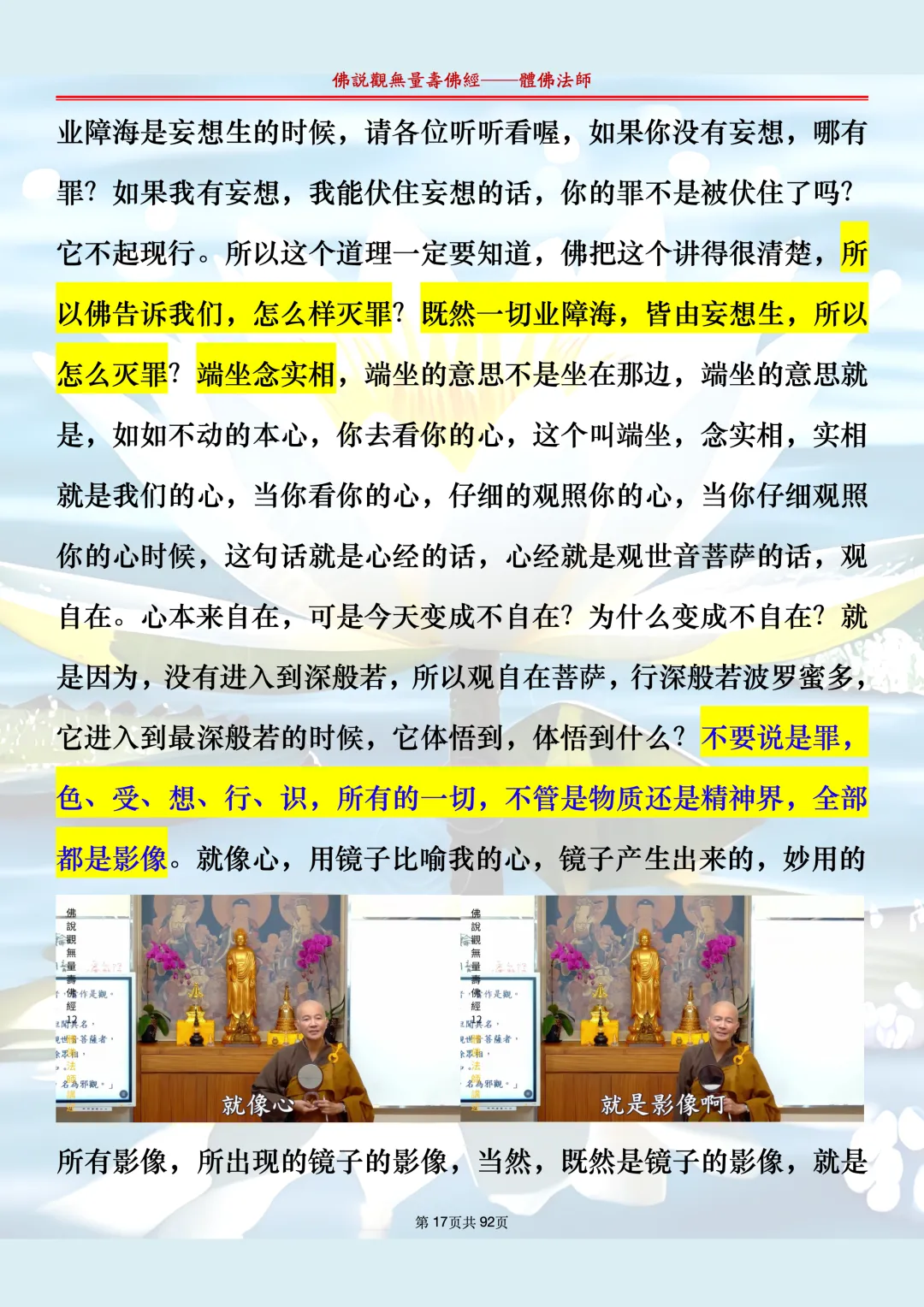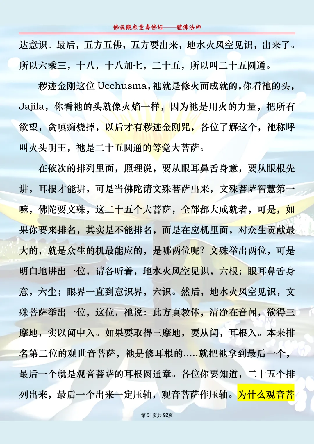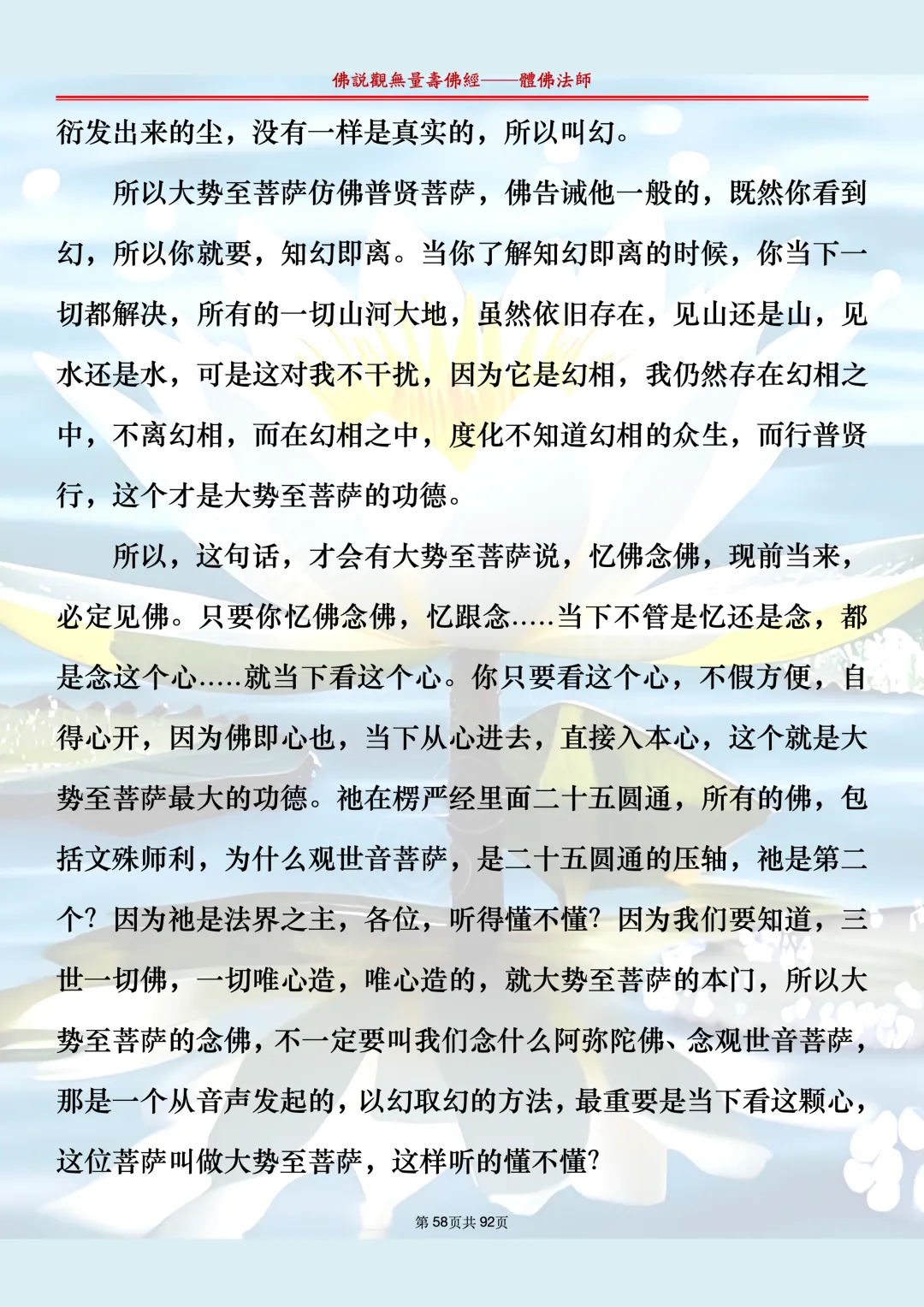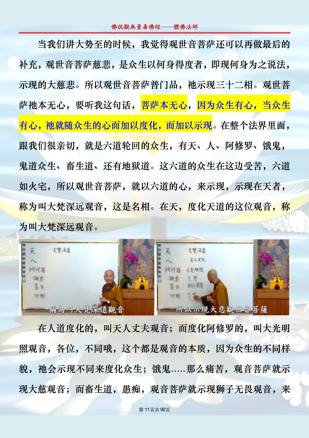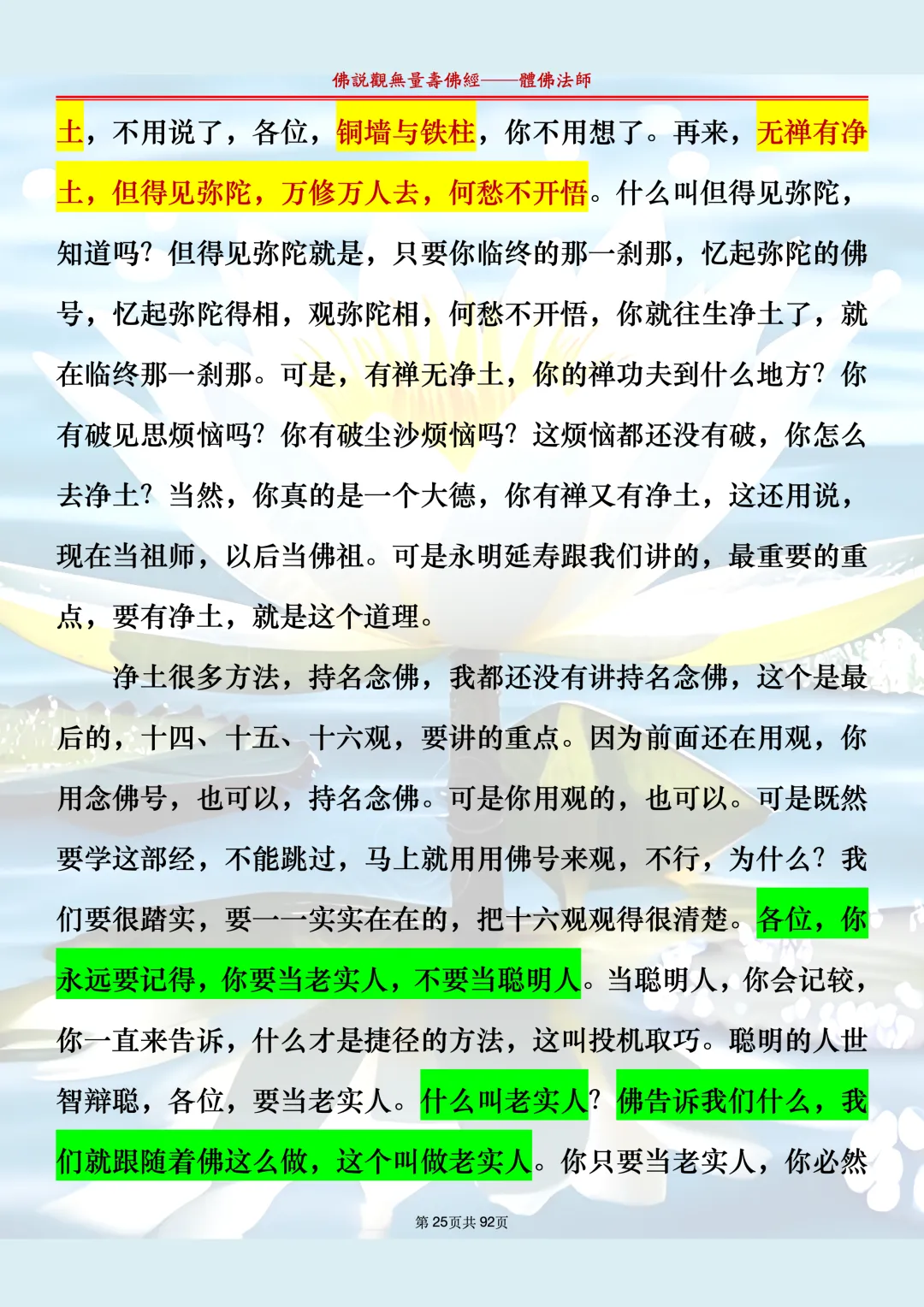 体佛法师讲解的《佛说观无量寿佛经》讲义,文字文档分享,是严格按照视频所讲,一句一句校对而整理,不出自任何团队,也不属于任何团队,也非视频转换软件提取的文字,所以文字准确率高。每一节课分成二段或者三段,依次分享。文字文档,是方便没有时间观看视频的情况下使用,非作他用,大家时间充裕的情况下,重点还是应以法师讲解的视频为主,文字是其次。