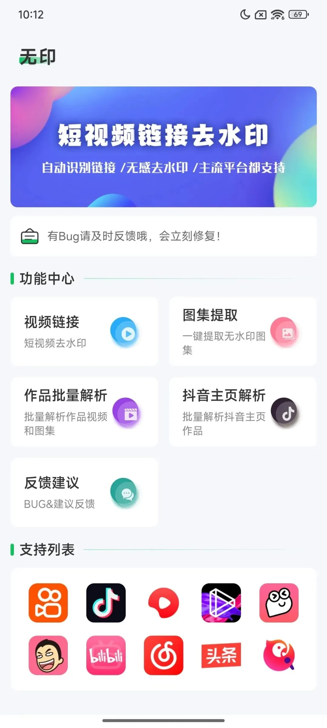 今天的软件是——无印,正如软件的名字一般,这是一款去水印工具,支持某音、某手、某书、某头条、小破站等平台的视频水印去除。