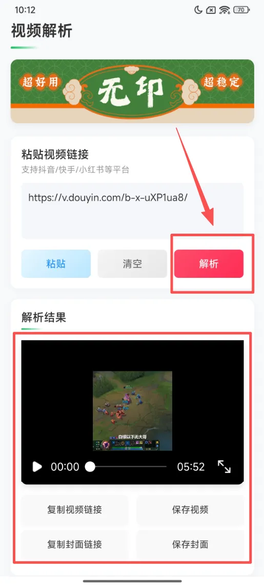 软件的使用方法也非常简单,只需将想要的视频链接复制到软件中(以某音为例),点击【解析】后,软件会自动将视频进行去水印解析处理,并且解析完成后,你还可以保存视频的封面,非常方便~