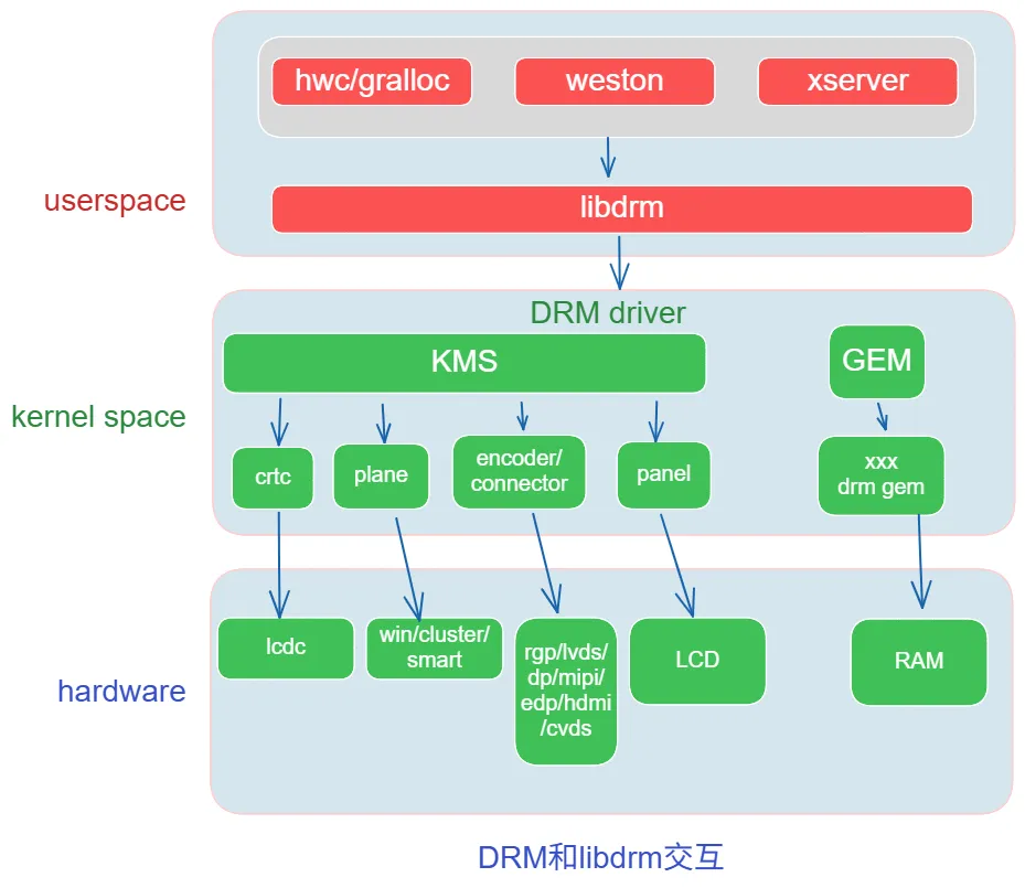 libdrm 是一个用户空间的 C 语言库,充当翻译官的角色,它封装了 Linux 内核 DRM 驱动复杂的 ioctl 系统调用,向上层应用程序(如 Weston 或 SurfaceFlinger)提供了一套标准的 API,用于分配图形内存、配置显示模式(Mode Setting)和提交帧数据