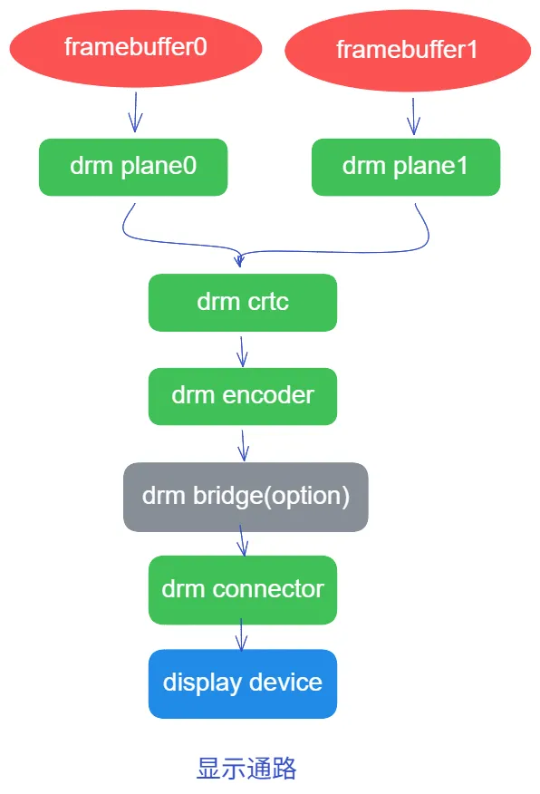 DRM 通用模型 (软件抽象层),可以把这一套理解为 “流水线上的四个工位”,数据流向是: Plane -> CRTC -> Encoder -> Connector -> Panel