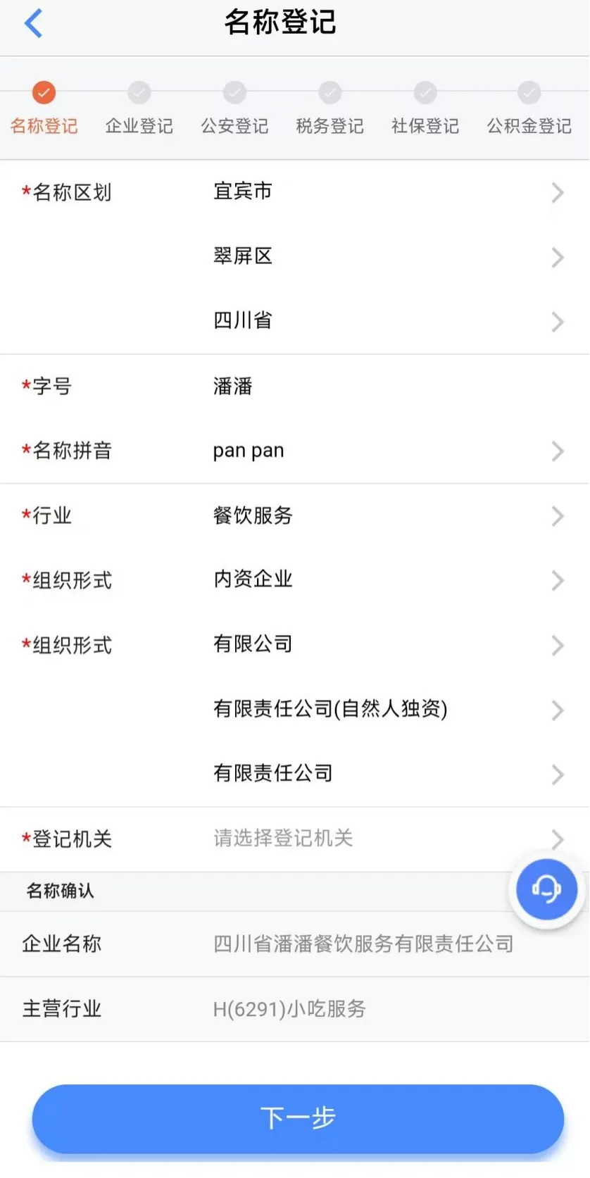 2.填报企业名称登记信息。按顺序填写“名称区划、字号、行业表述、组织形式”等信息后选择登记机关,系统自动生成拟设立企业名称。