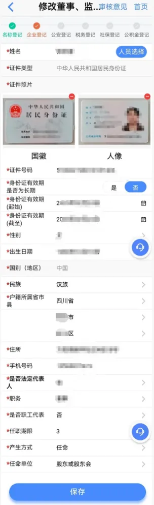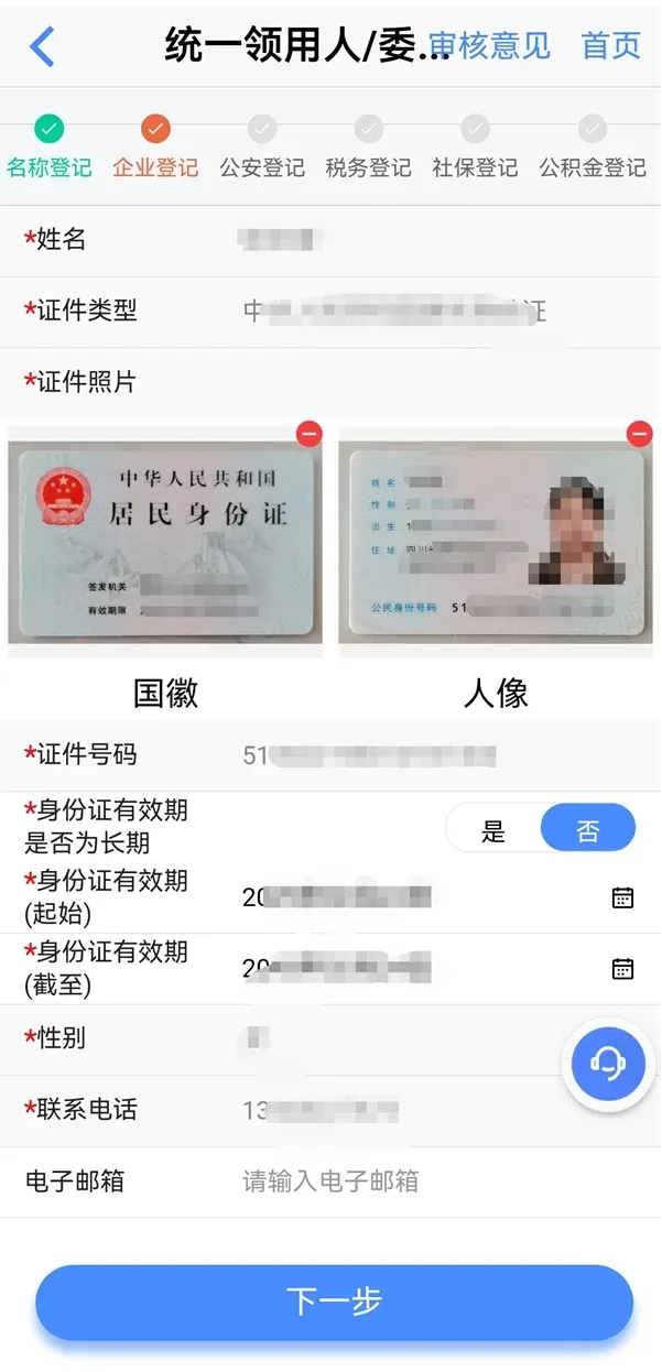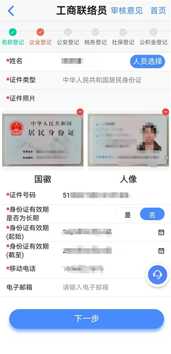 3.填报委托代理人或工商联络员信息。委托代理人默认为登录人,工商联络员可选择登录人或上传其他人身份证进行信息录入。