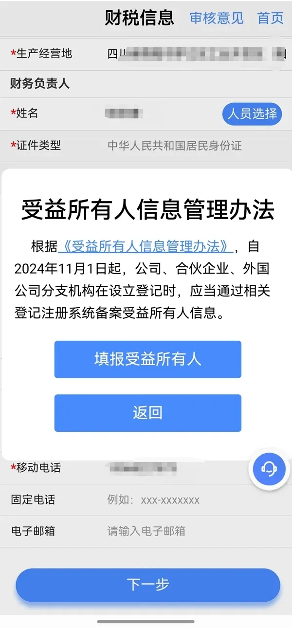 9.填报财税信息和受益所有人信息。特别提醒:监事不能同时担任财务负责人。