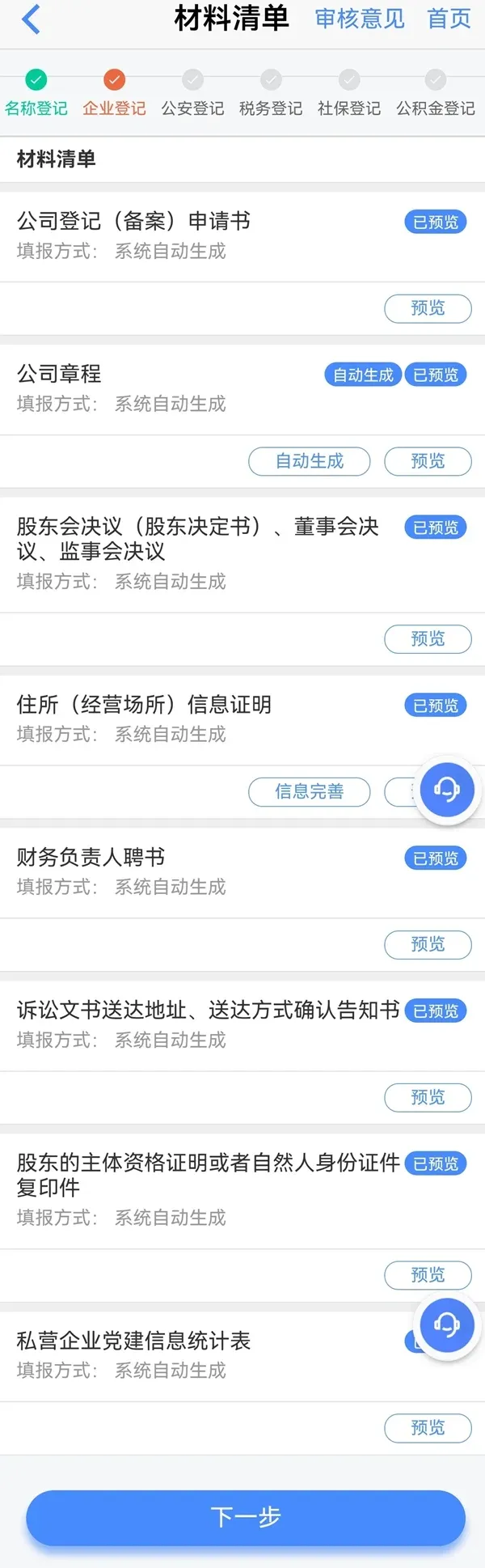 10.预览材料清单。需完善相关材料的,先进行“信息完善”,再预览材料。