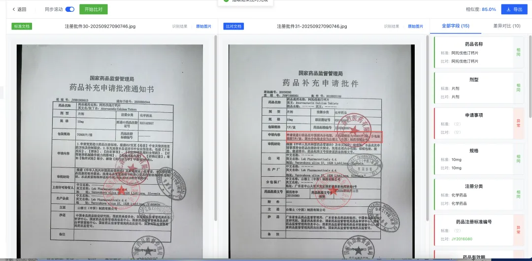比对效率较人工提升10倍以上,批量文档比对可快速完成,大幅缩短文档处理周期;同时简化比对流程,减少前期格式转换、人工录入等准备工作,提升跨部门协作效率,加快业务推进速度。