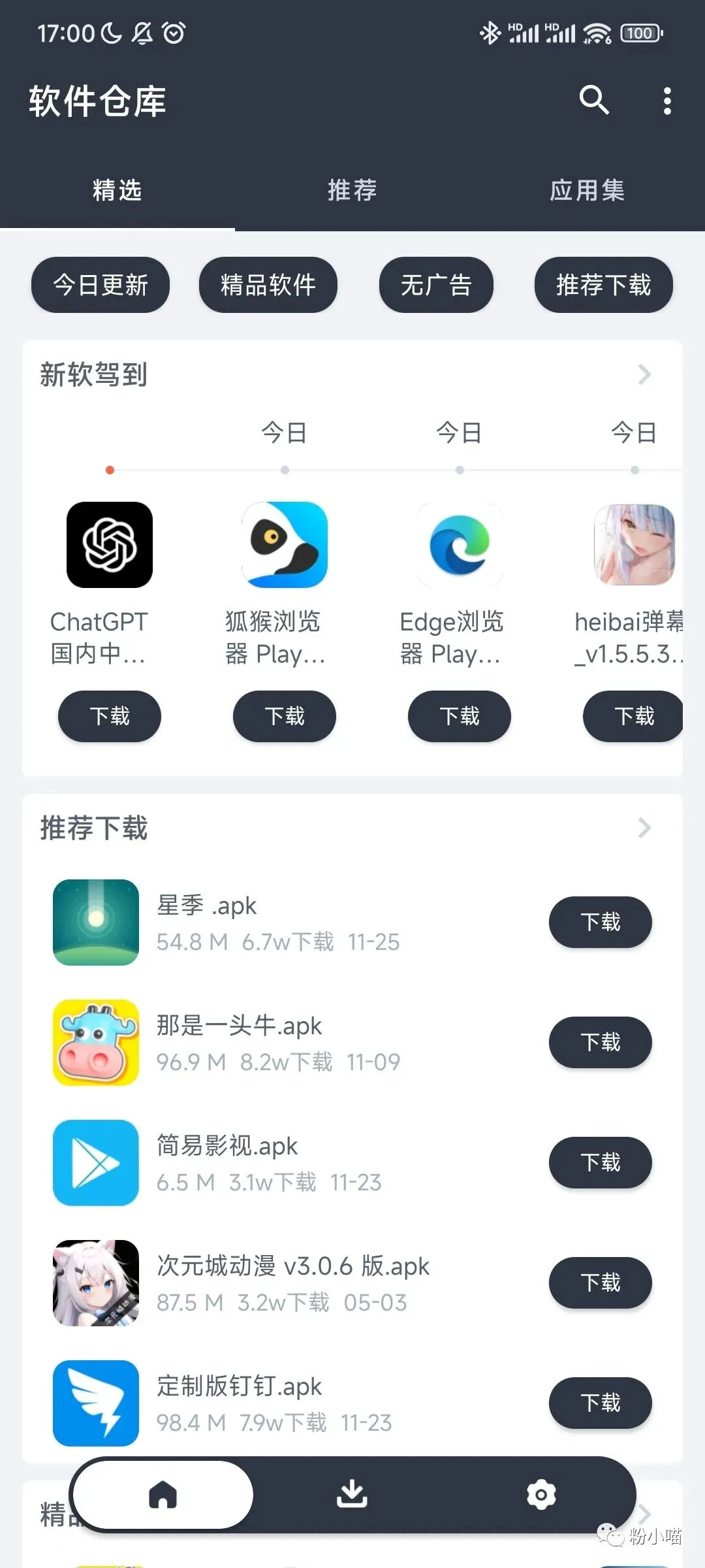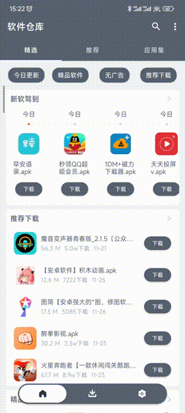 打开该软件,就会发现它类似于一个应用商店,首页上展示了各种精选软件,有新上线的软件、作者推荐的软件以及精品软件和无广告的软件,种类非常丰富。
