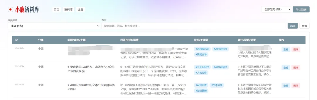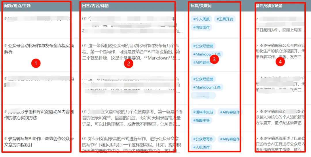 这种结构化的数据,你可以快速导出后发送给AI进行文章输出或者知识萃取,也可以做成知识库,是投喂给AI智能体(Agent)完美的养分。