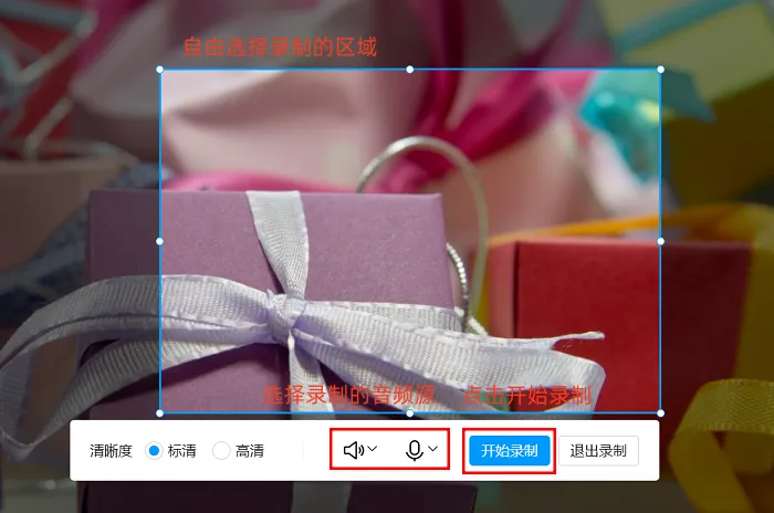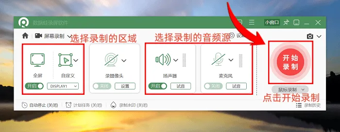 第二步:进入准备界面,先确定录屏范围(可选全屏或自定义),接着设置好音频输入源,完成后点击【开始录制】按钮即可;