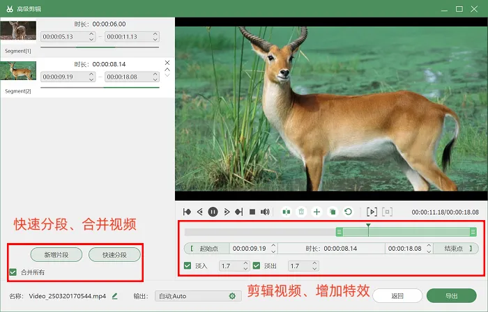 第三步:录制结束后,若有后期处理需求,可直接点击【高级剪辑】按钮,对视频进行分段切割、添加特效等操作。