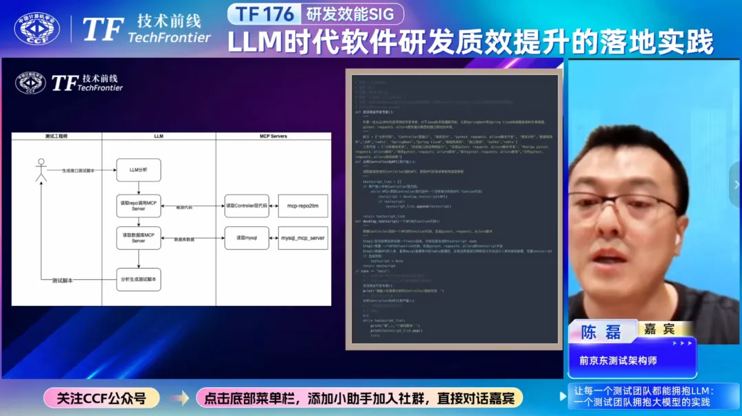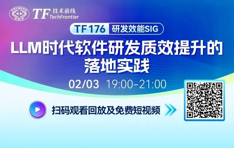 2026年2月3日晚,CCF TF(技术前线)第176期直播线上举办。本期以“LLM时代软件研发质效提升的落地实践”为主题,邀请到三位在平台工程、测试革新与AI编程领域深耕多年的专家,从架构思维到实践路径,深度解析了LLM与研发流程的融合之道。