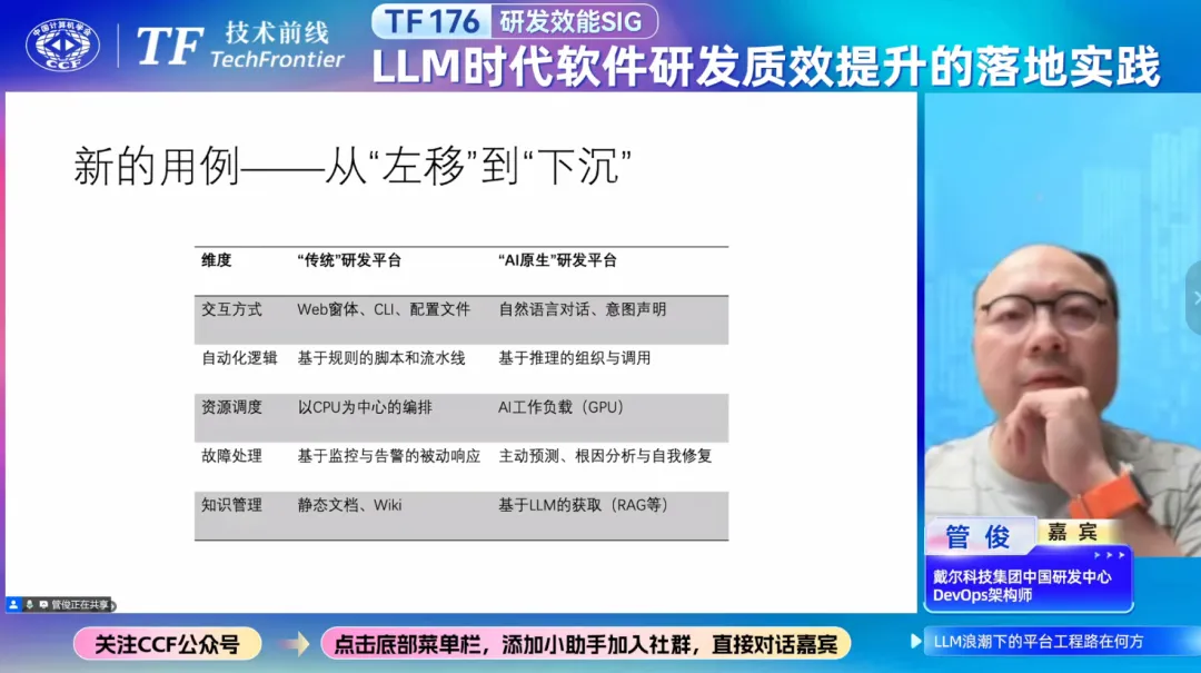 管俊提出,应当推动平台工程从“左移”向“下沉”演进:将LLM与ChatOps深度融合,通过自然语言交互与AI推理,消解系统复杂度,让平台“隐形”于意图之后。他强调,LLM应作为“数字成员”融入研发全生命周期,实现从自动化到智能化、自治化的思维跨越,从而全面放大平台效能,盘活企业既有技术资产。