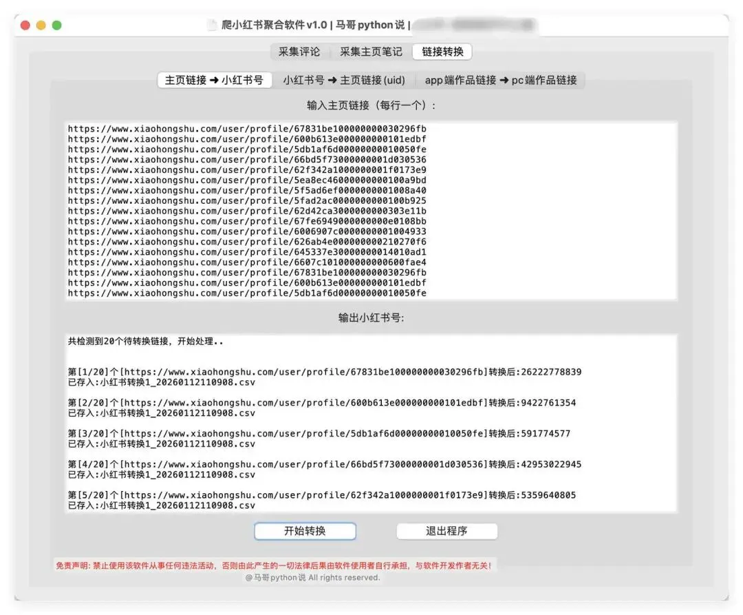 软件含三个核心功能:①根据关键词/笔记链接采集评论;②根据主页链接采集笔记;③uid转换 -