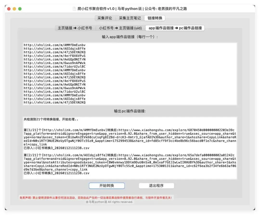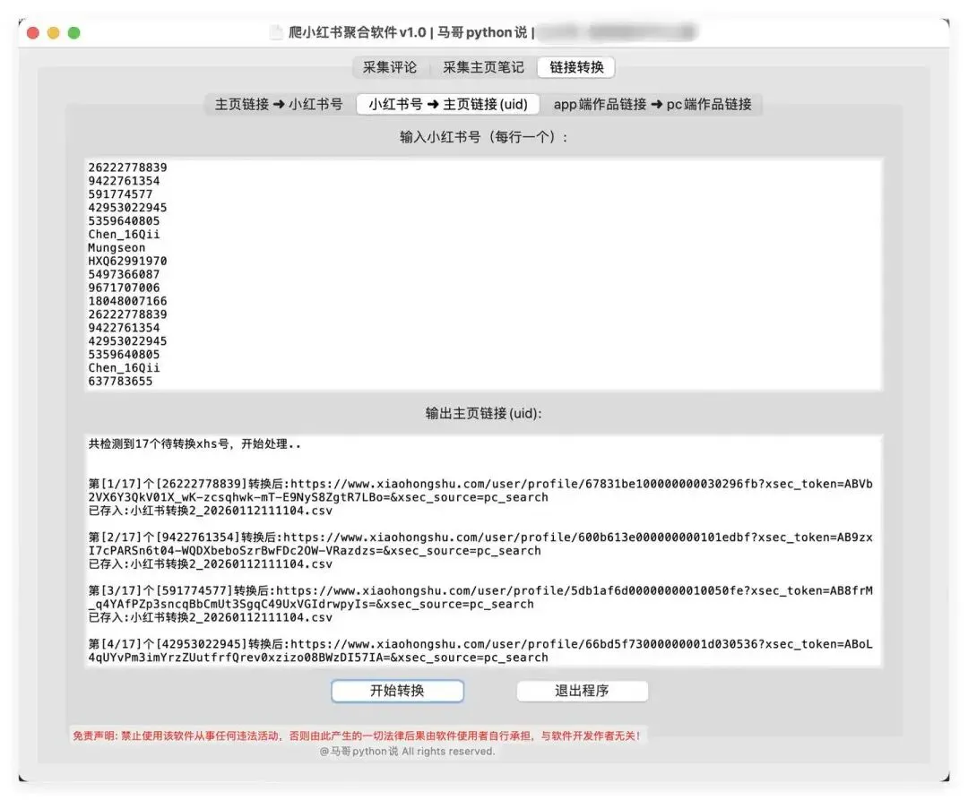 小红书作为国内极具影响力的社区种草平台,汇聚了大量用户且拥有极高的日活跃度,其笔记数据蕴含丰富的信息价值。之前,为了满足大家不同的数据采集需求,我分别独立开发了三款软件:针对评论采集的“爬小红书搜索评论软件”、专门采集特定博主内容的“爬小红书博主软件”,还有专门转换链接uid的“小红书转换工具”。