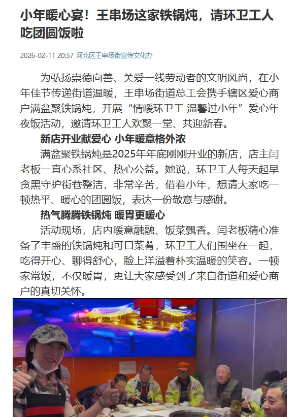 为弘扬崇德向善、关爱一线劳动者的文明风尚,在小年佳节传递街道温暖,王串场街道总工会携手辖区爱心商户满盆聚铁锅炖,开展“情暖环卫工 温馨过小年”爱心年夜饭活动,邀请环卫工人欢聚一堂、共迎新春。