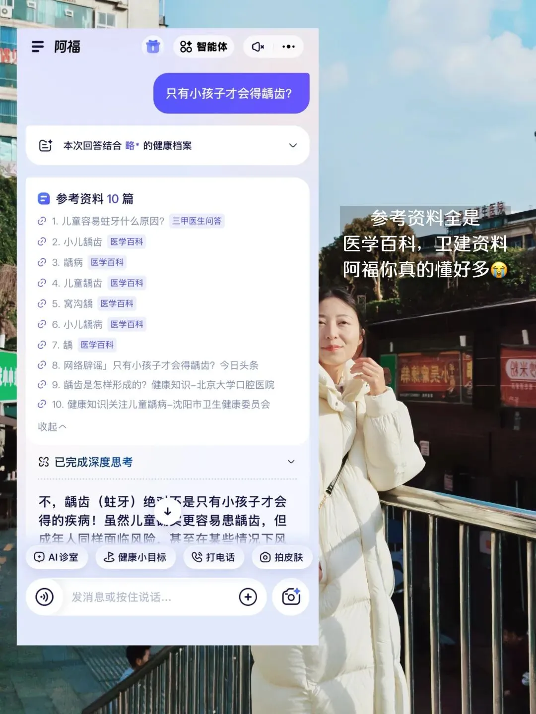 把娃这颗牙的情况输了进去,它解答时候还会“结合娃的健康档案”,(健康档案是可以建立的)针对她的年纪、病史信息做判断,直接把文献呈了上来,光是参考资料就用了10篇医学百科什么的。