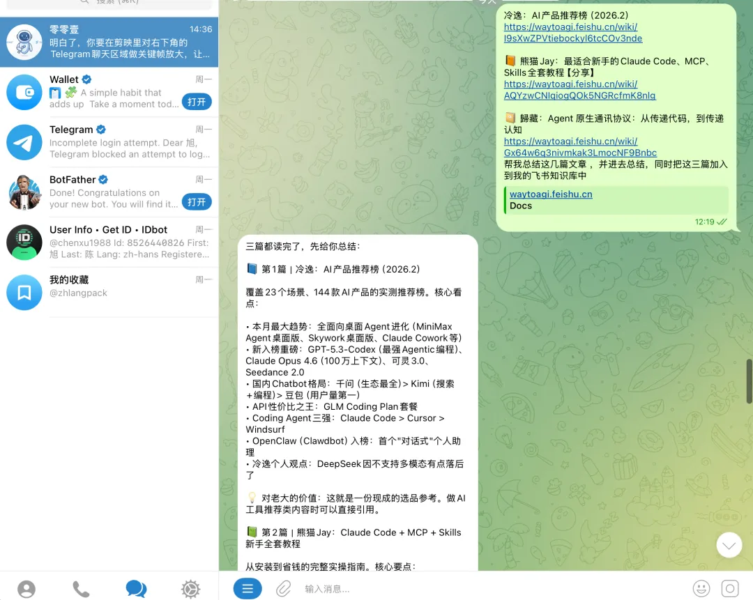 📸【①】对话截图:发送文章链接给它,它自动整理进知识库
