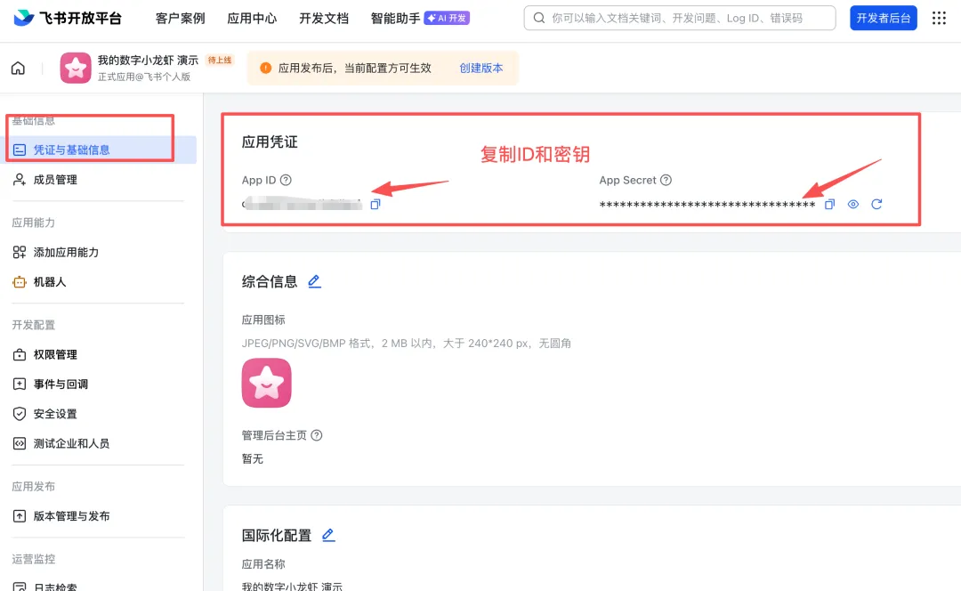 左侧菜单找「凭证与基础信息」,记下App ID和App Secret——这就是数字员工的”钥匙”