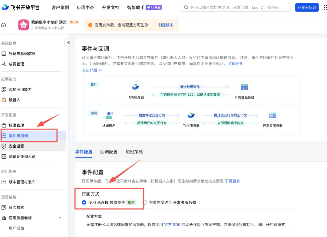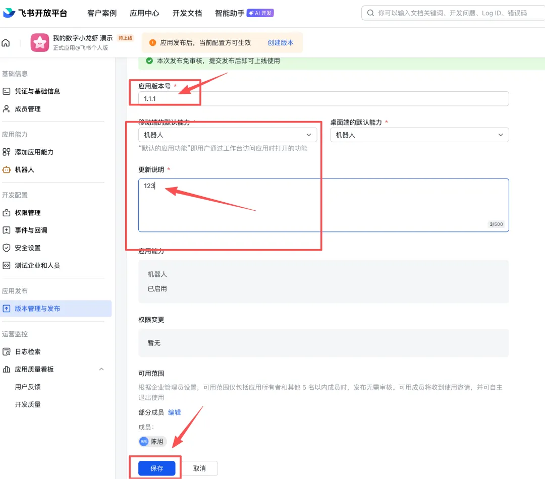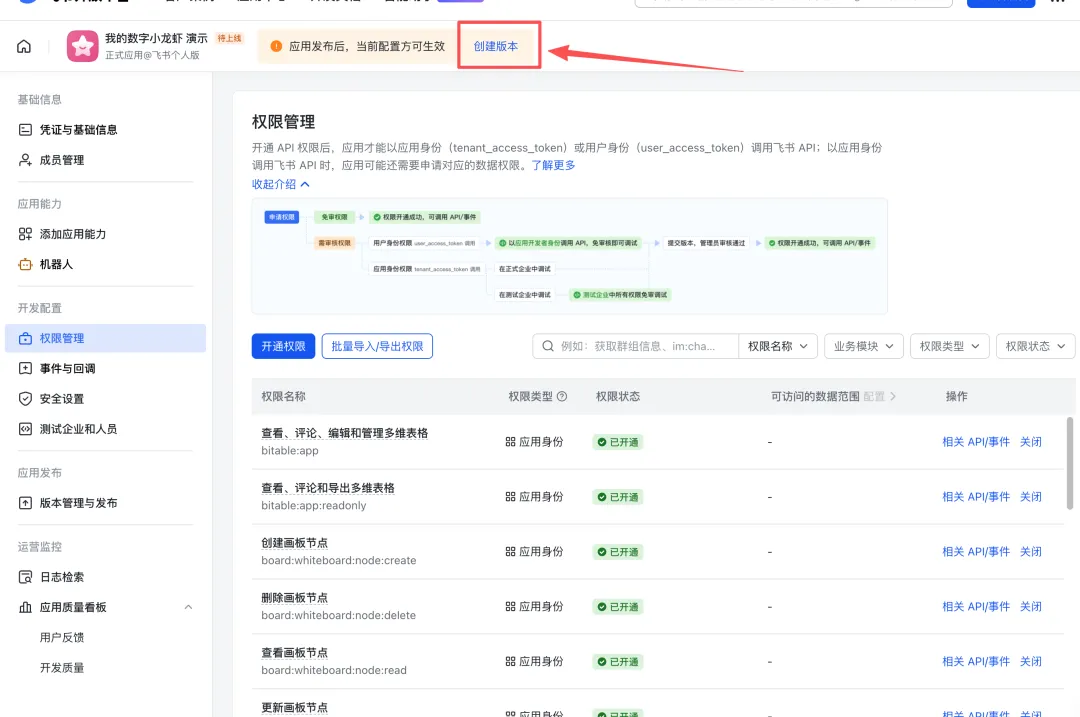 开通后需要发布应用版本,点「版本管理与发布」→「创建版本」→ 提交审核 -