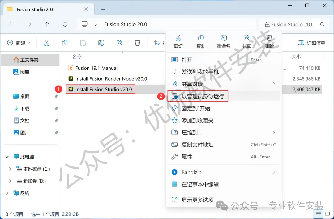 3、找到【Install Fusion Studio v20.0】应用程序,右键选择【以管理员身份运行】它