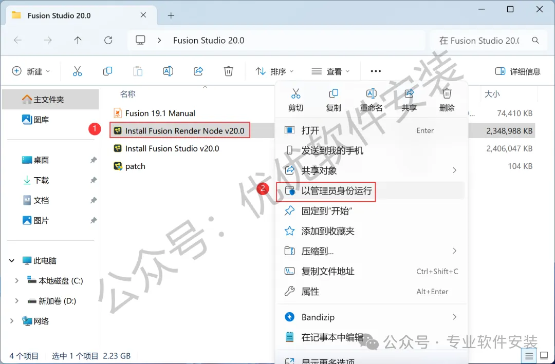 9、回到Fusion Studio 20.0文件夹,找到【Install Fusion Render Node v20.0】应用程序,右键选择【以管理员身份运行】它