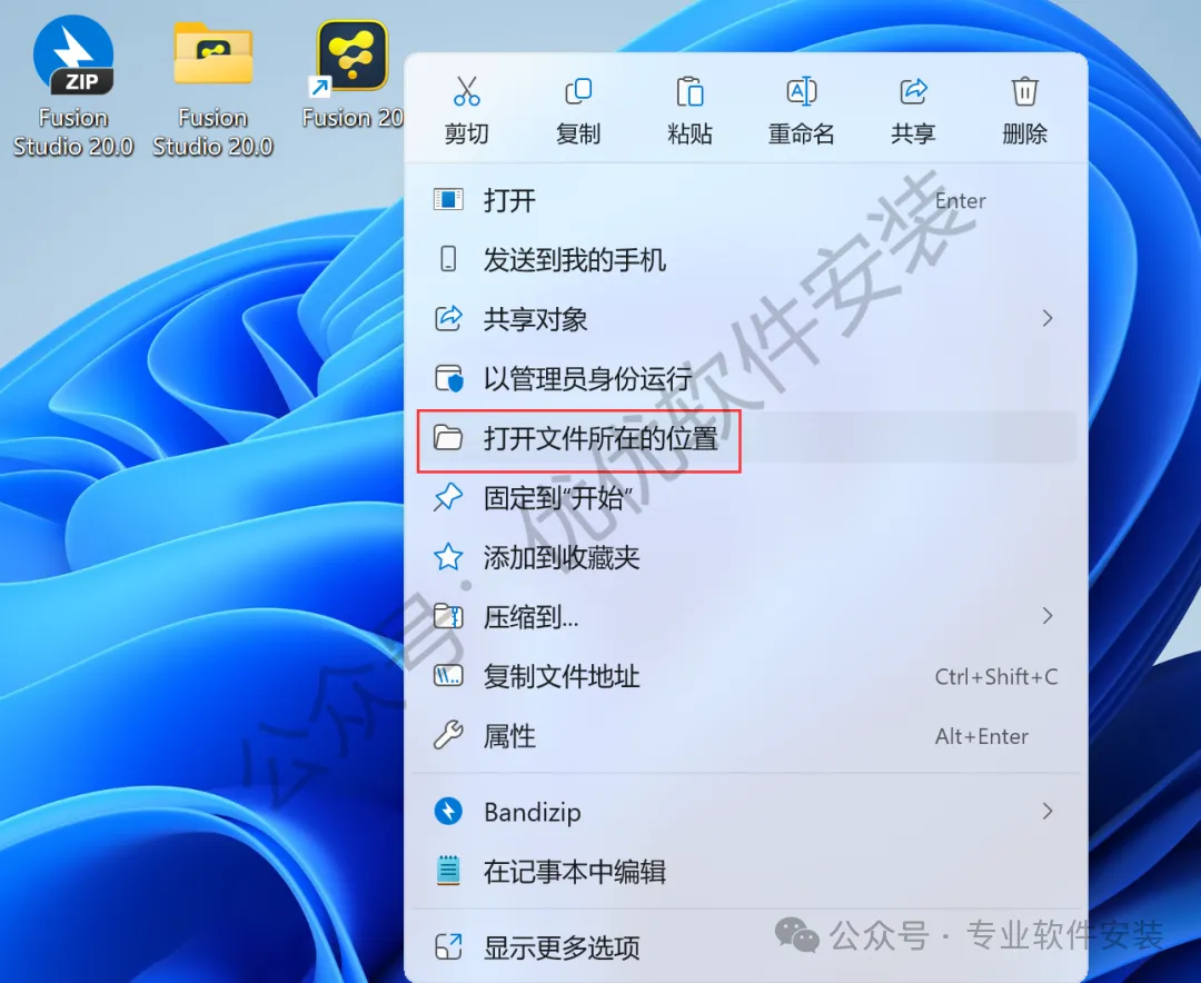 15、回到桌面,右键桌面上的【Fusion 20软件图标】,点击【打开文件所在的位置】