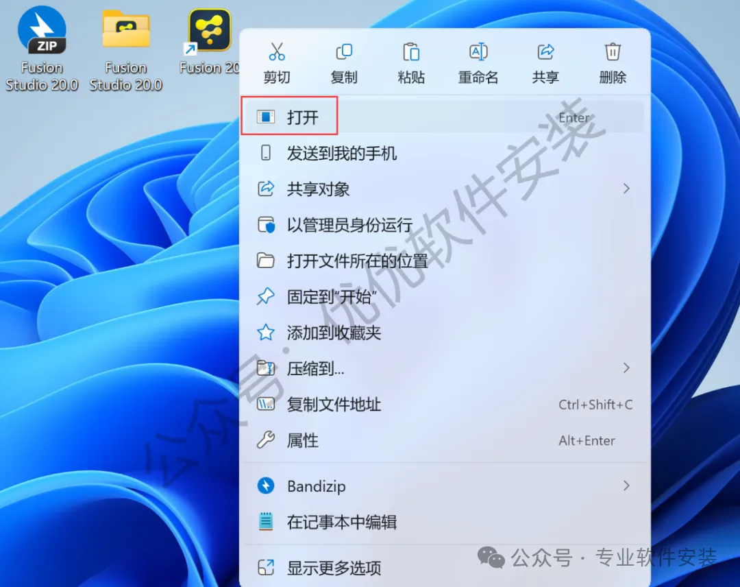 20、回到桌面,右键桌面上的【Fusion 19软件图标】,点击【打开】