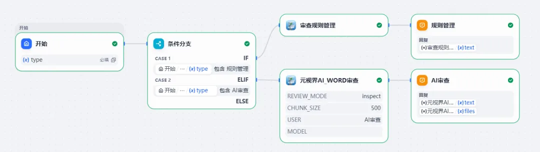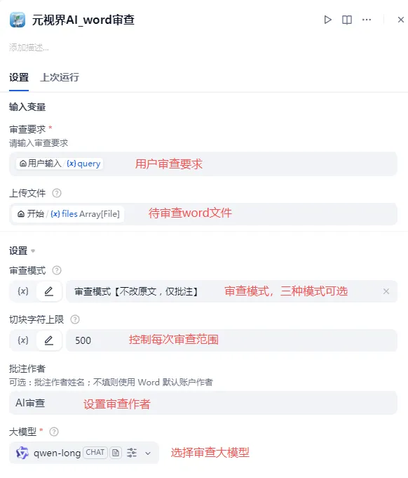 字符切块数:这个参数很重要,最小是500,最大是20000,这是保障大模型不超上下文以及审查精度的关键,插件会以这个字数来切块去给大模型喂送文本,越小,精度越高,但时间花费就越长,越大,精度会降低,但审批时间会快。需大家结合自身文档的情况来灵活调配。