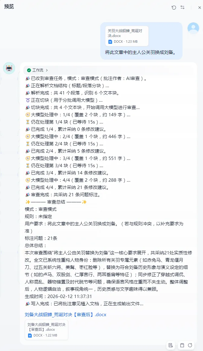 插件会对文档进行解析,分段,审批,最终再合成,输出审批后的文档,从图中我们可以看到,他甚至按我们的要求更改了文件名字~