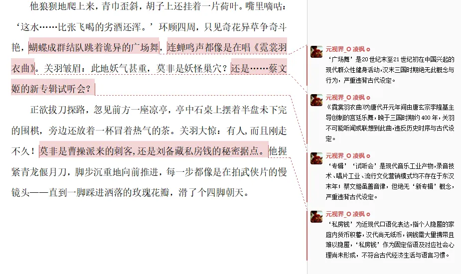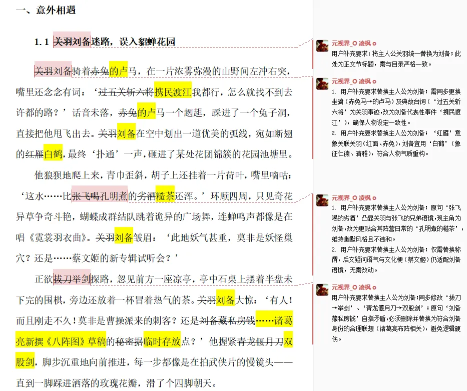 普通模式,就是直接修改,没有这些删除线,高亮和批注。审查模式我们再测试一下:审查一下文章中不符合古代设定的内容。