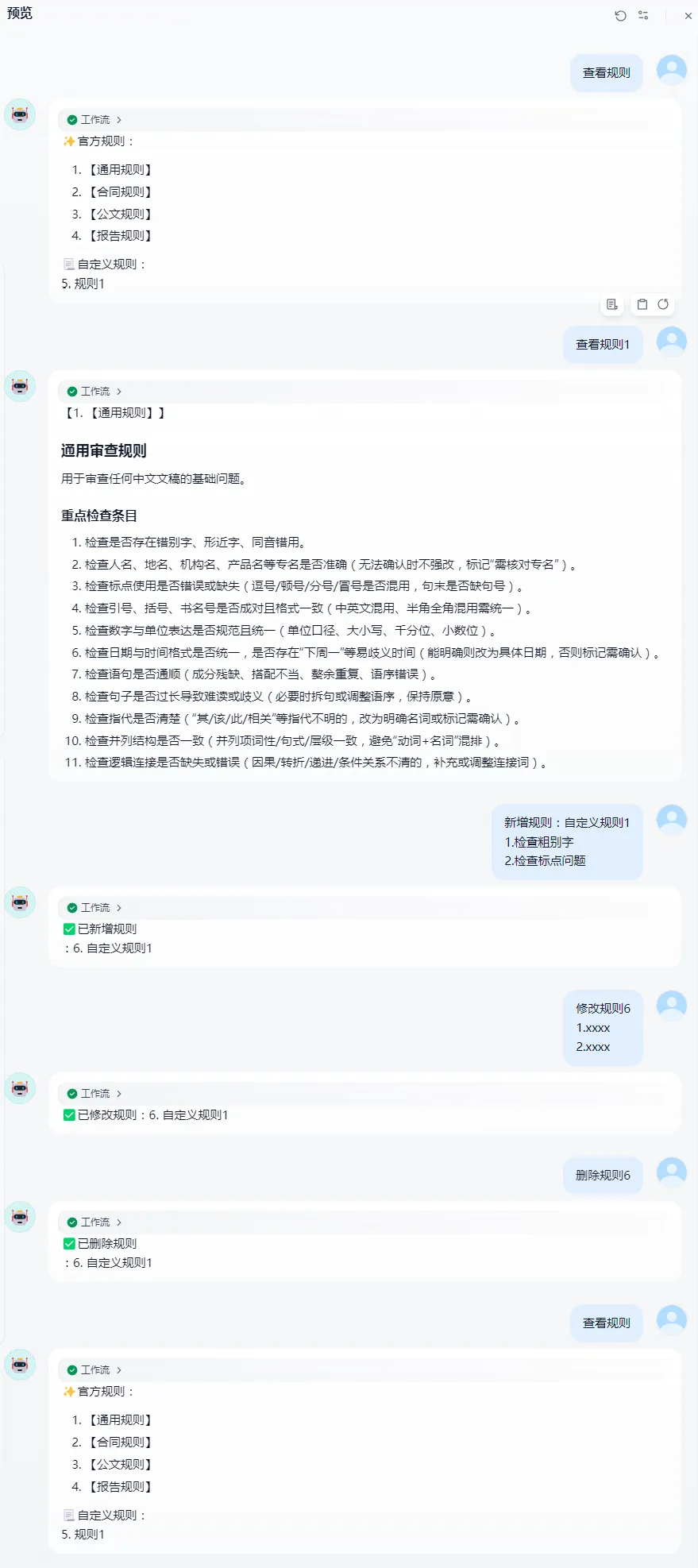 好的,以上就是AI word审查的功能了,接下来我们讲讲高阶的用法,我们的审查要求规则,有时候会很多,比如再面向基于合同,一些专业文档的时候,有一些好的规则我们想保存下来重复利用,那这里就需要用到我们的规则管理工具。我们可通过输入:查看规则,新增规则,修改规则,删除规则来管理规则,每一份规则下面可以有多条内容。