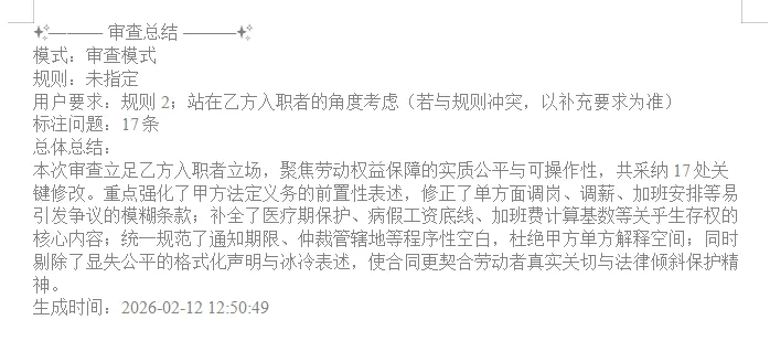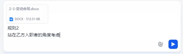 然后我们只需要上传待审核的文档,输入我们的审查要求,发送就可以了。