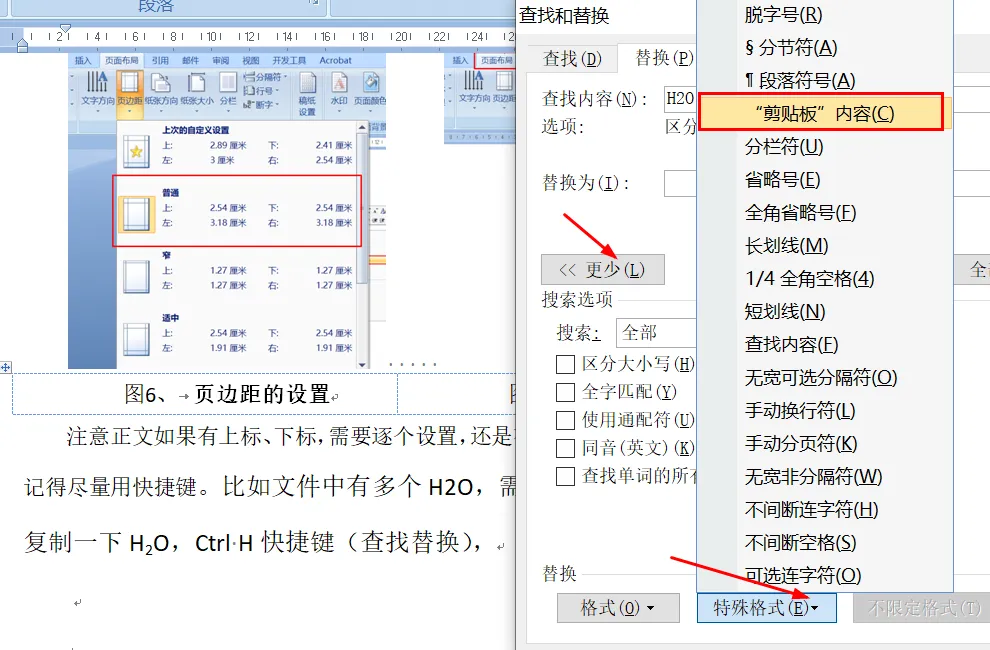 注意正文如果有上标、下标,需要逐个设置,还是有共同的可以用快捷键的,记得尽量用快捷键。比如文件中有多个H2O,需要设置为H2O,可以先复制一下H2O,Ctrl H快捷键(查找替换),查找框粘贴一下,H2O就录入了,替换框,点选特殊格式,选剪切板内容。全部替换。这样全文中的H2O就一次性的替换为H2O了。再有有些简单的上下标,选中上标的内容后,按快捷键,“ctrl Shfit =”就是上标,“ctrl=”就是下标。