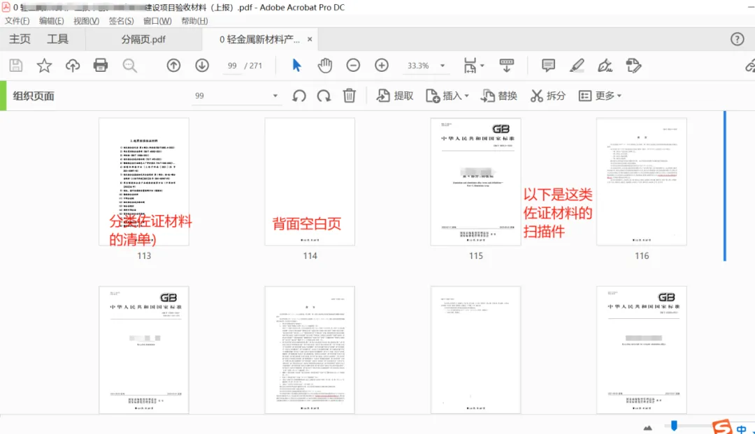 好像很多pdf文件,不见得都是word文件生成的,所以有的文件本身就是扫描件,在合并的时候,需要添加一个分隔页,比如,申请专利清单(小目录页),后面附上每一项专利的受理通知书,比如,授权专利清单(小目录页),后面附上每一项专利的证书。那么就会出现这样的情况:分隔页(正面是XXX佐证材料,题目下面列上本类材料的清单)、然后空白页、之后是本类佐证材料的全部扫描件。