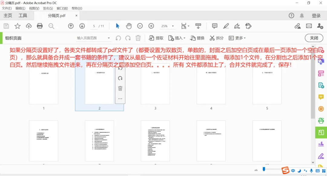如果分隔页设置好了,各类文件都转成pdf文件了(都要设置为双数页,页数单数的,封面之后加空白页或在最后一页后添加一个空白页),那么就具备合并成一套书籍的条件了,建议从最后一个佐证材料开始往里面拖拽,每添加1个文件,在分割页之后添加1个空白页。然后继续拖拽文件进来,再在分隔页之后添加空白页。。。。所有的文件都添加上了,合并文件就完成了,保存!