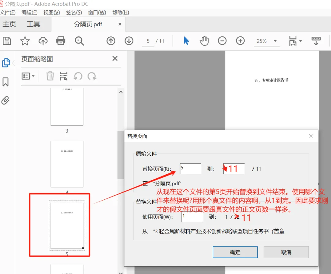 打开带总目录的那个合订本文件(假文件),左侧点开。页面缩略图,点替换页面,具体谁替谁,怎么替,看图吧,肯定是真的替掉假的了。