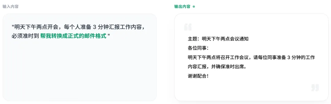 当你急匆匆地对着电脑说:“明天下午两点开会,每个人准备3分钟汇报工作内容,必须准时到,帮我转换成正式的邮件格式。”