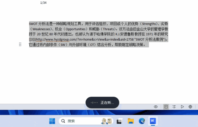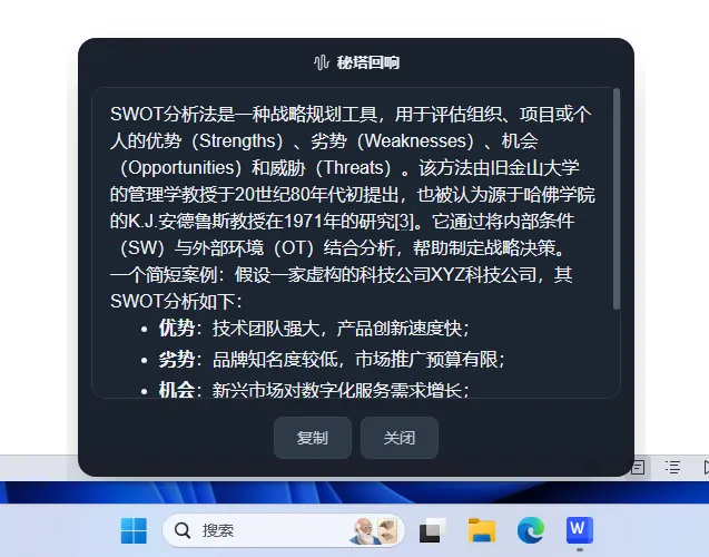 直接唤起「回响」,说出你想查的内容:“搜索一下什么是SWOT分析法,并列举一个简短的案例。”