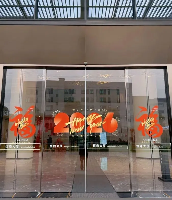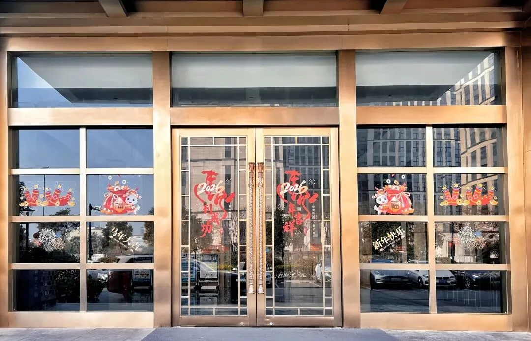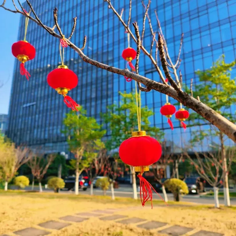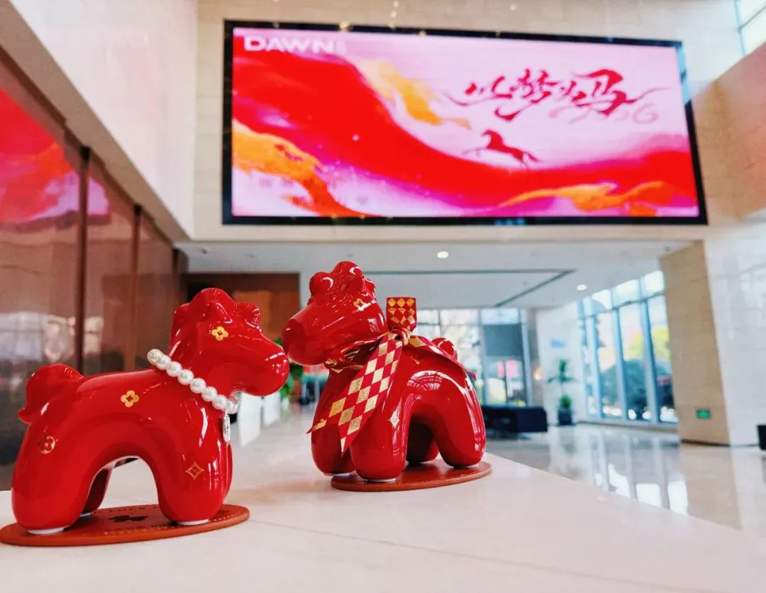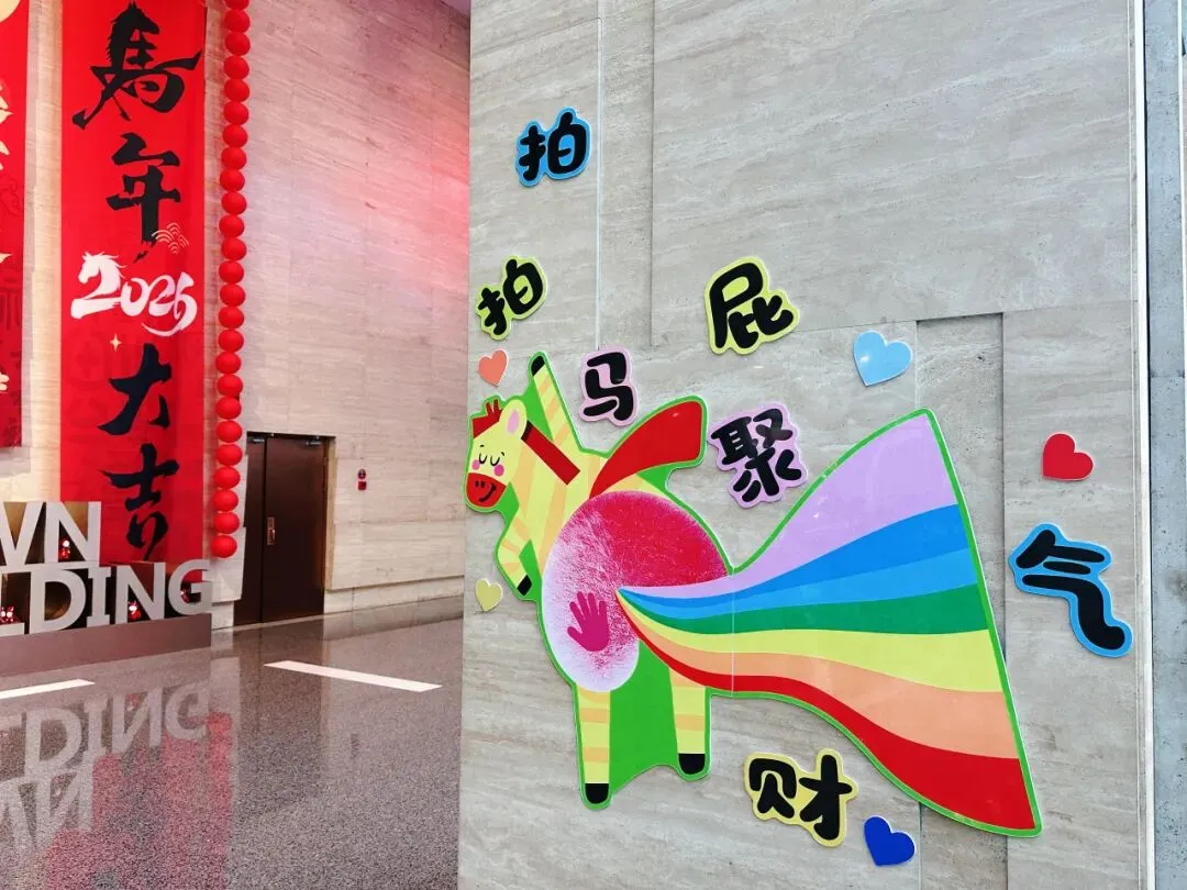 园区树上红灯笼、中国结错落点缀,大厅里卡通小马摆件憨态可掬,玻璃门上马年专属窗花格外吸睛……