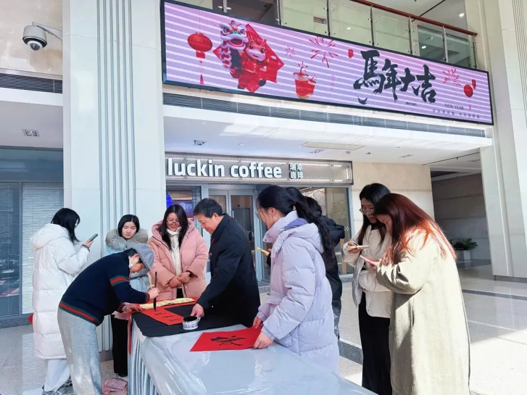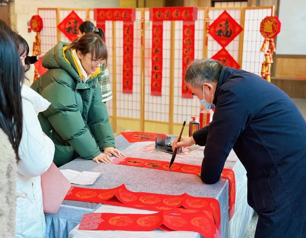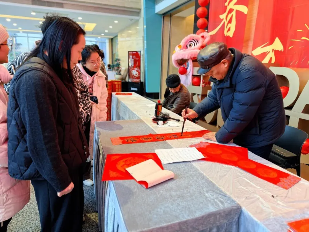 热闹不止于视觉,更藏在笔墨流转的温情里。园区特意举办 “翰墨贺岁” 写福字活动,邀请书法老师现场挥毫。活动现场,园区企业员工们围在桌前踊跃点单,笔尖划过红纸,墨香混着年味在空气中弥漫。