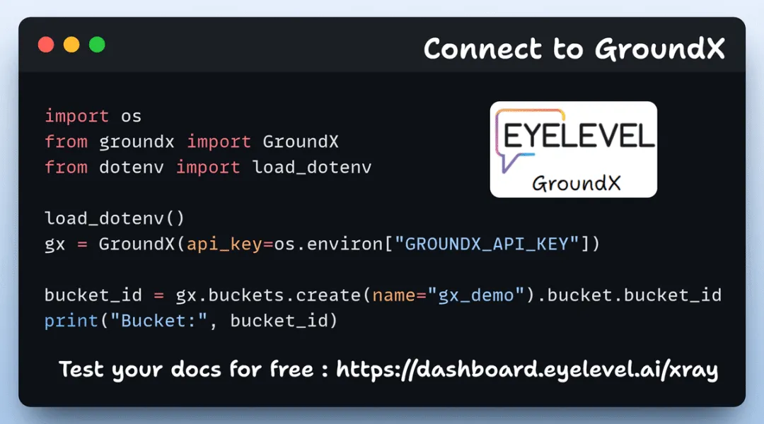 在 GroundX 中,每个文档都存储在一个桶(bucket)中。我们连接到 API 并为我们的工作流创建一个桶。