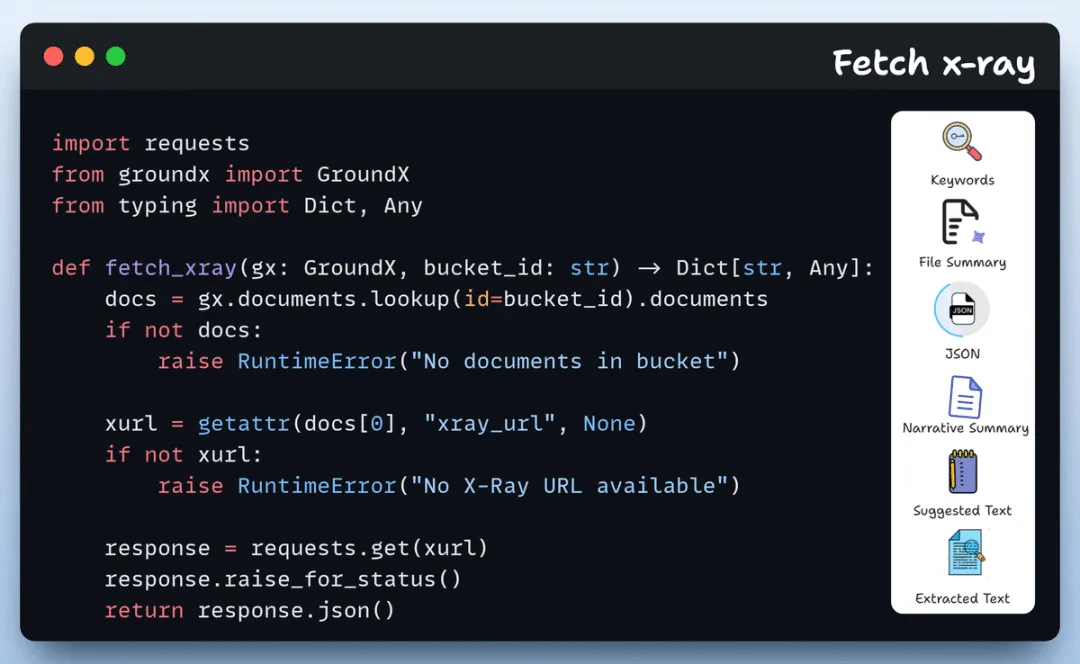 GroundX 解析并提供丰富的分析,包括摘要、分块(chunks)和元数据(metadata) -