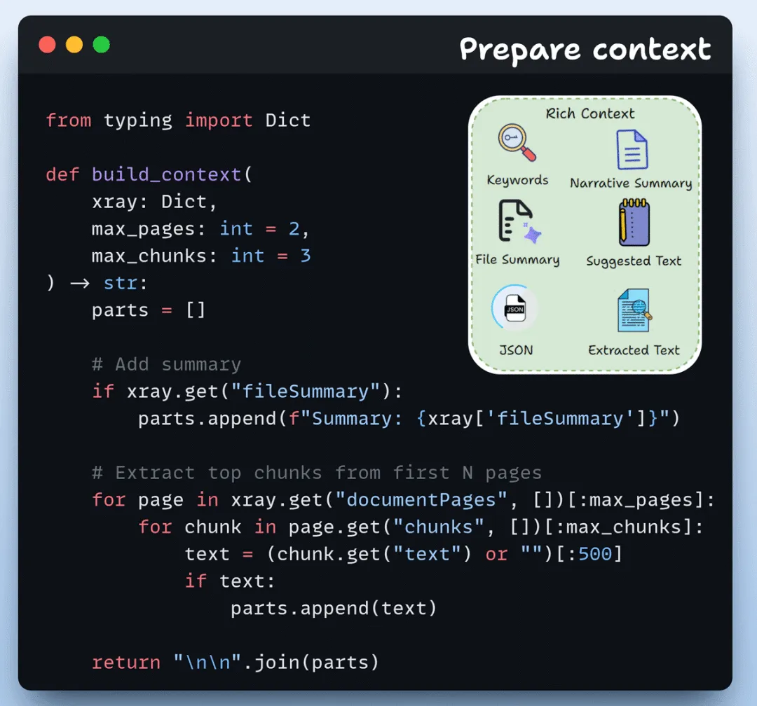 我们结合文档的摘要与几个顶部块,这样大语言模型就有足够细节来准确回答,而不会超载。