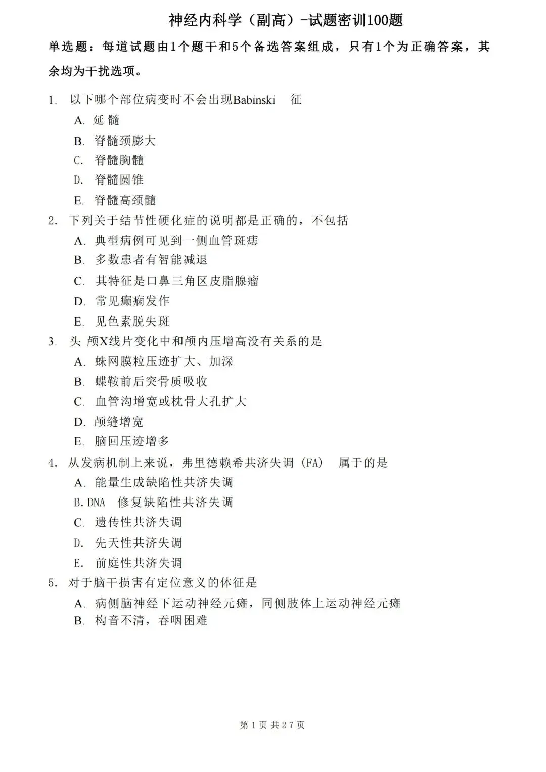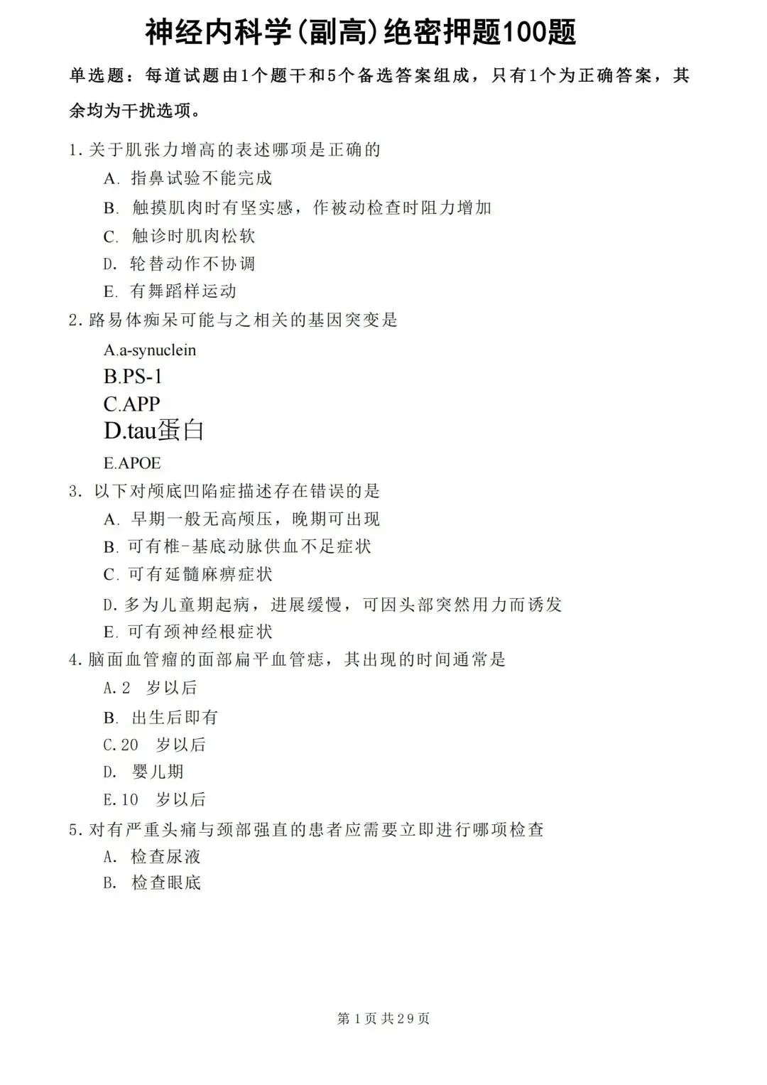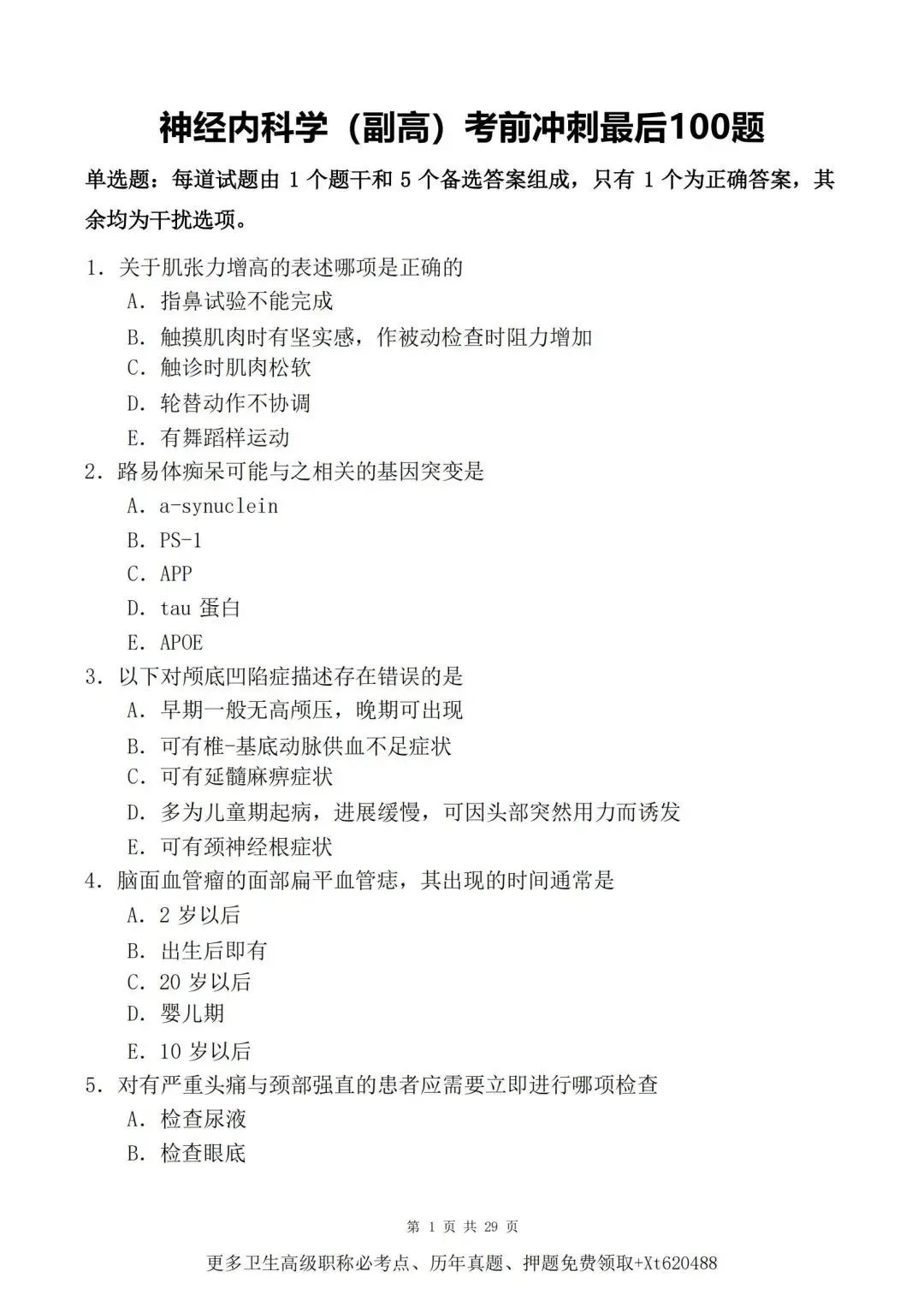 五、神经内科学高级职称005历年真题【历年真题—真题是对考试考点、难度的真实反映,先过一遍历年真题,了解考情和考点,卫生职称往往会存在历年真题重现,考生重点把握】