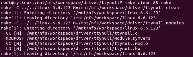 PWD := $(shell pwd)# 指向内核源码目录KDIR ?= ../../linux-6.6.123obj-m += ttynull.oall:$(MAKE) -C $(KDIR) M=$(PWD) modulesclean:$(MAKE) -C $(KDIR) M=$(PWD) clean
