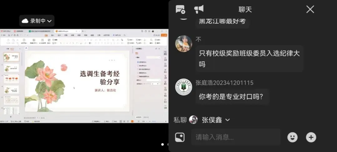 答疑环节持续近40分钟,同学们通过聊天框踊跃提问:“选调生两年后能调岗吗?”“体检项目与标准如何?”“黑龙江哪些地区竞争较小?”耿浩伦逐一耐心解答,提供中肯建议。互动区内实时滚动的提问,体现同学们对基层就业的关注。