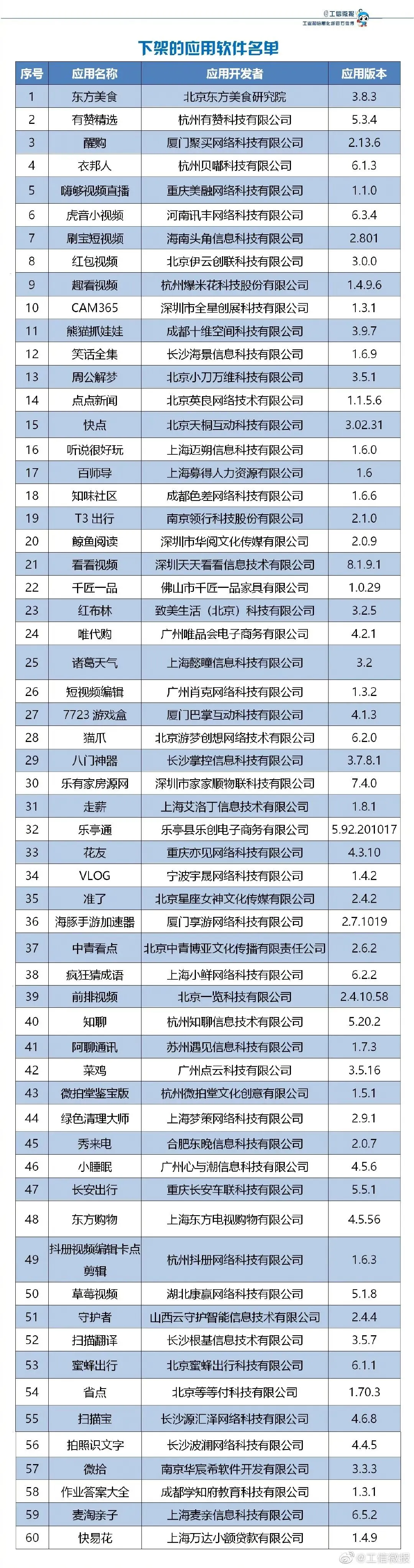 10月26日,工业和信息化部向社会通报了131家存在侵害用户权益行为App企业的名单。截至目前,经第三方检测机构核查复检,尚有60款App未按照工业和信息化部要求完成整改。依据《网络安全法》和《移动智能终端应用软件预置和分发管理暂行规定》(工信部信管〔2016〕407号)等法律和规范性文件要求,工业和信息化部组织对上述App进行下架。