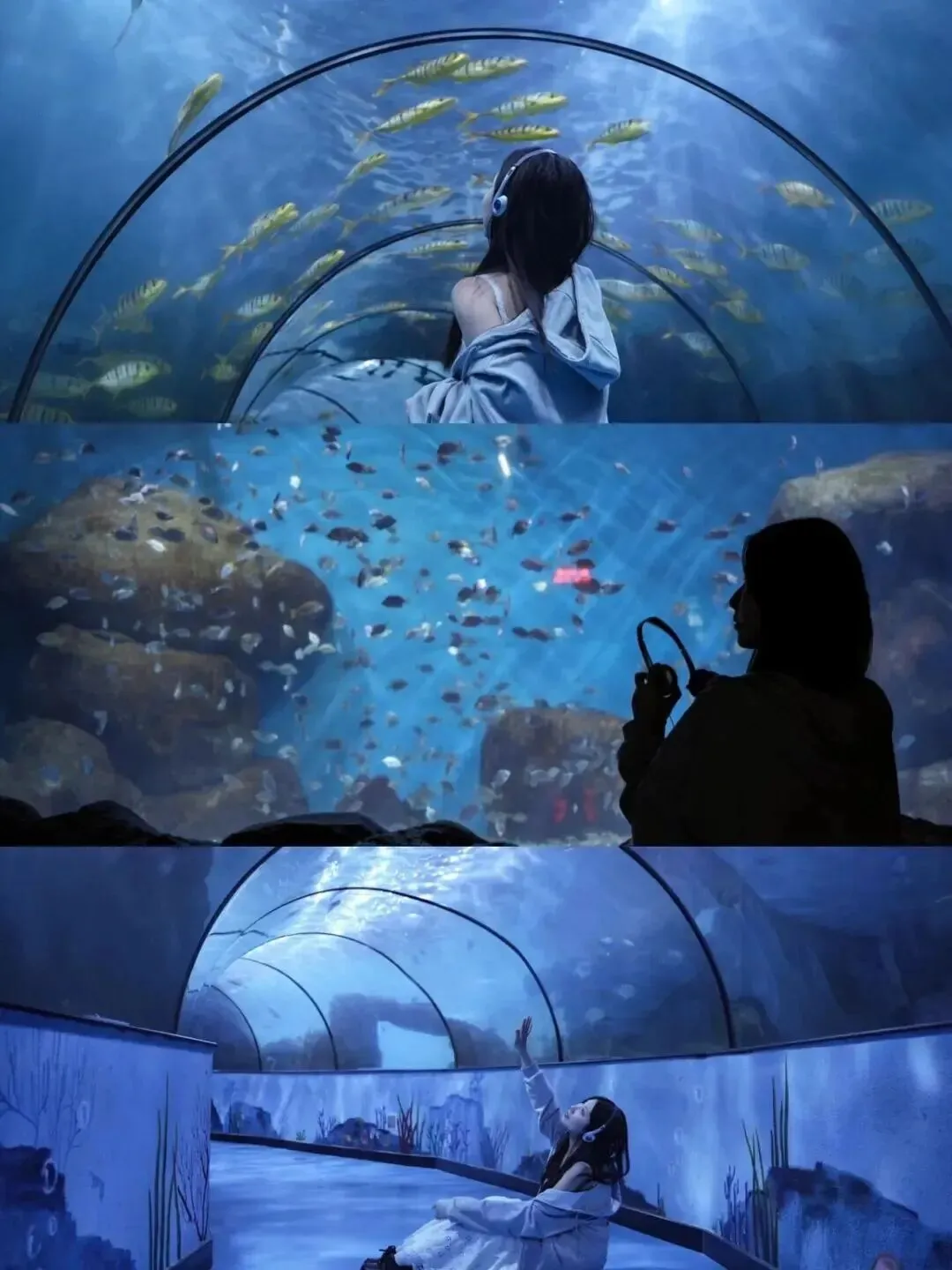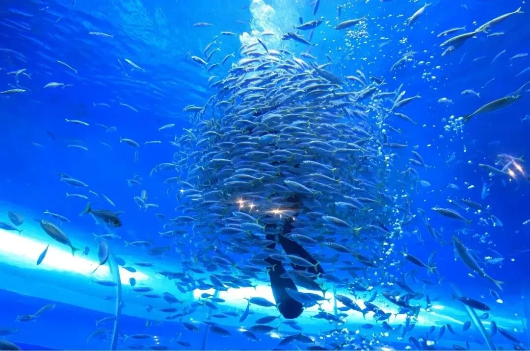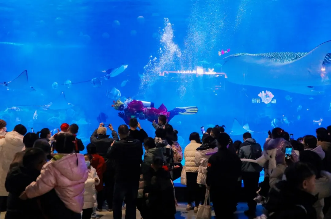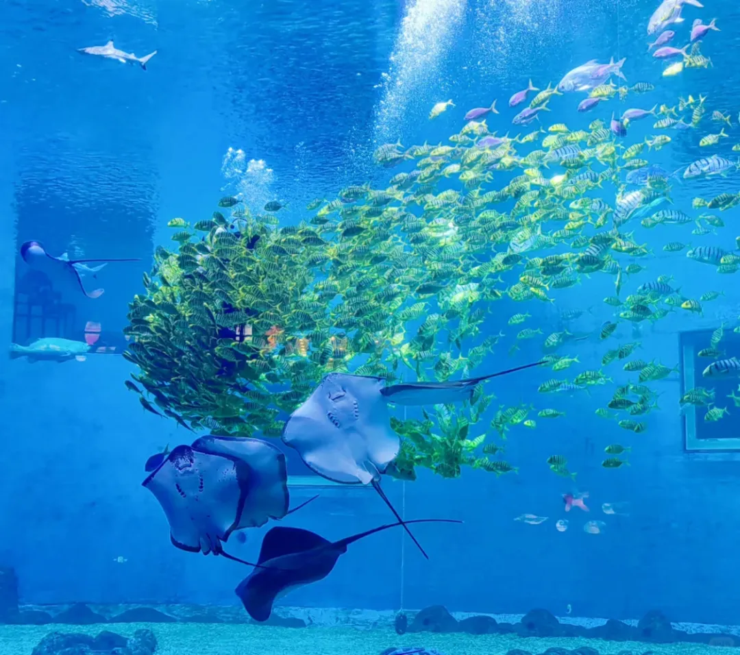 漫步海底隧道,鲸鲨优雅游过头顶,鳐鱼展开双翼宛如海中飞鸟,万千热带鱼群组成流动的彩虹,仿佛坠入蓝色梦幻秘境。