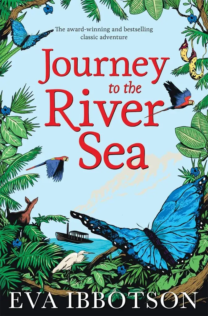 这本书的封面设计充满热带风情,四周环绕着茂密的绿叶、蓝色蝴蝶、鹦鹉、蛇和白鹭等雨林生物,中央是一艘小船航行在河流上,整体画面生动地呼应了书名中的“River Sea”与探险主题。作者伊娃·伊博森是英国著名儿童文学作家,其作品常以奇幻、冒险和温情著称,深受全球青少年读者喜爱。